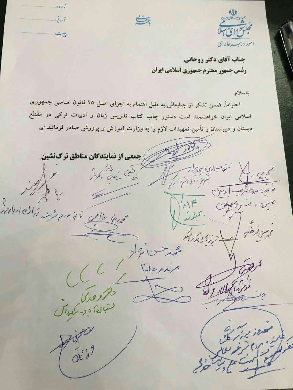 نامه ۴۲نفر از نمایندگان تورک مجلس به روحانی جهت تدریس زبان تورکی در مدارس + تصاویر و اسامی