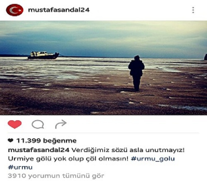 مصطفی ساندال خواننده مشهور تورکیه که در ایران او را بیشتر با آهنگ اونون آراباسی وار میشناسند، در صفحه اینستگرام شخصی خود، ضمن گذاشتن تصویری از آخرین وضعیت دریاچه اورمیه نوشت: ما حرفی را که زده ایم فراموش نمیکنیم. دریاچه اورمیه نباید از بین برود و تبدیل به کویر نگردد.