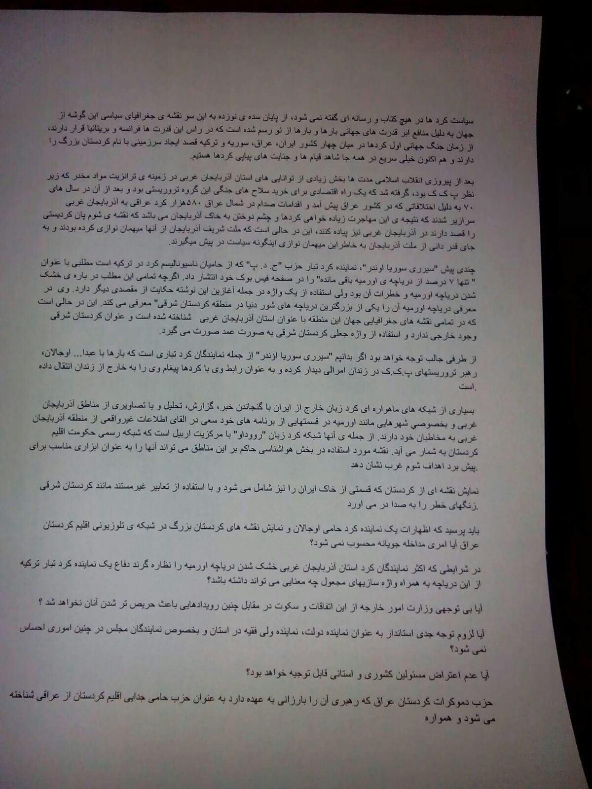 همچنین در پایان و در قسمت سئوال از مسئولین نظام آورده شده است که آیا این قدرت مبارزه مسلحانه کردها میباشد که سیاستهای نظام در مقابل ترور ، قاچاق و جنایات گروهکهای تروریسم کردی را به سکوت وا داشته است .