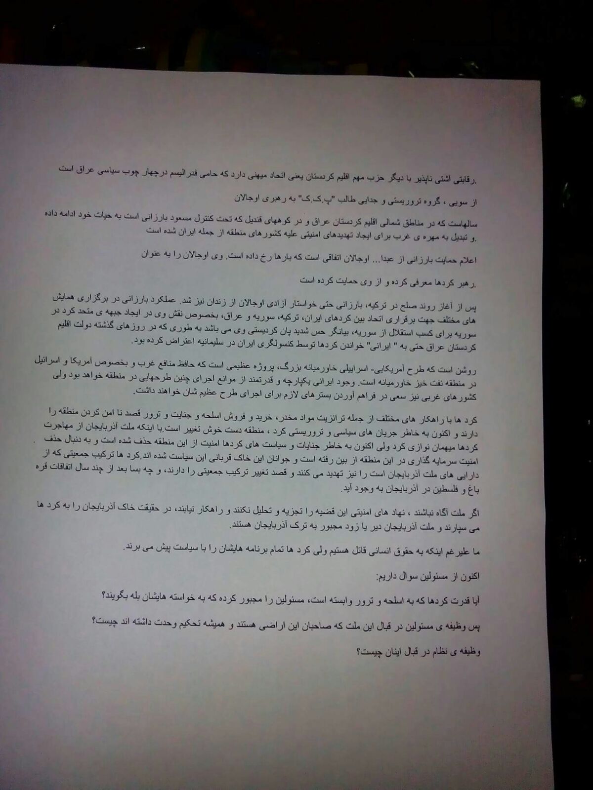 بنا به اطلاع آراز نیوز، ایجاد ناامنی توسط تروریسم کردی جهت تهدید سرمایهگذاری در آزربایجان ، سیاستهای مداخله جویانه بارزانی در غرب آزربایجان و نقش نمایندگان کرد پارلمان ترکیه به عنوان هماهنگ کنندگان گروهکهای تروریستی در منطقه از جمله مسائلی هستند که در این شبنامه بدان اختصاص یافته است.