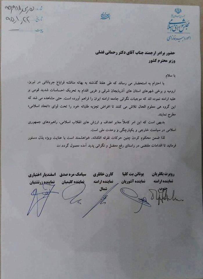 اخیرا نامهای به تاریخ ۱۳۹۵-۰۱-۲۲ با امضا پنج نفر از نمایندگان اقلیتهأی دینی مجلس شورأی اسلامی ایران به رحمان فضلی وزیر کشور ایران نوشته شده که در آن نامه نگرانی جامعه ارامنه ایران را از آنچه که ''تحرکات قومی تجزیه طلبان آذری'' پس از جنگ اخیر در قره باغ صورت گرفته بیان نموده اند.