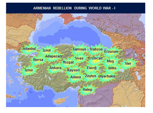 از سال های ۱۸۹۰ ارمنی های عثمانی در هر گوشه آناتولی دست به عصیان زدند. نقشه زیر همه مناطقی که ارمنی ها در اثنای جنگ جهانی اول دست به شورش زدند، نشان می دهد.