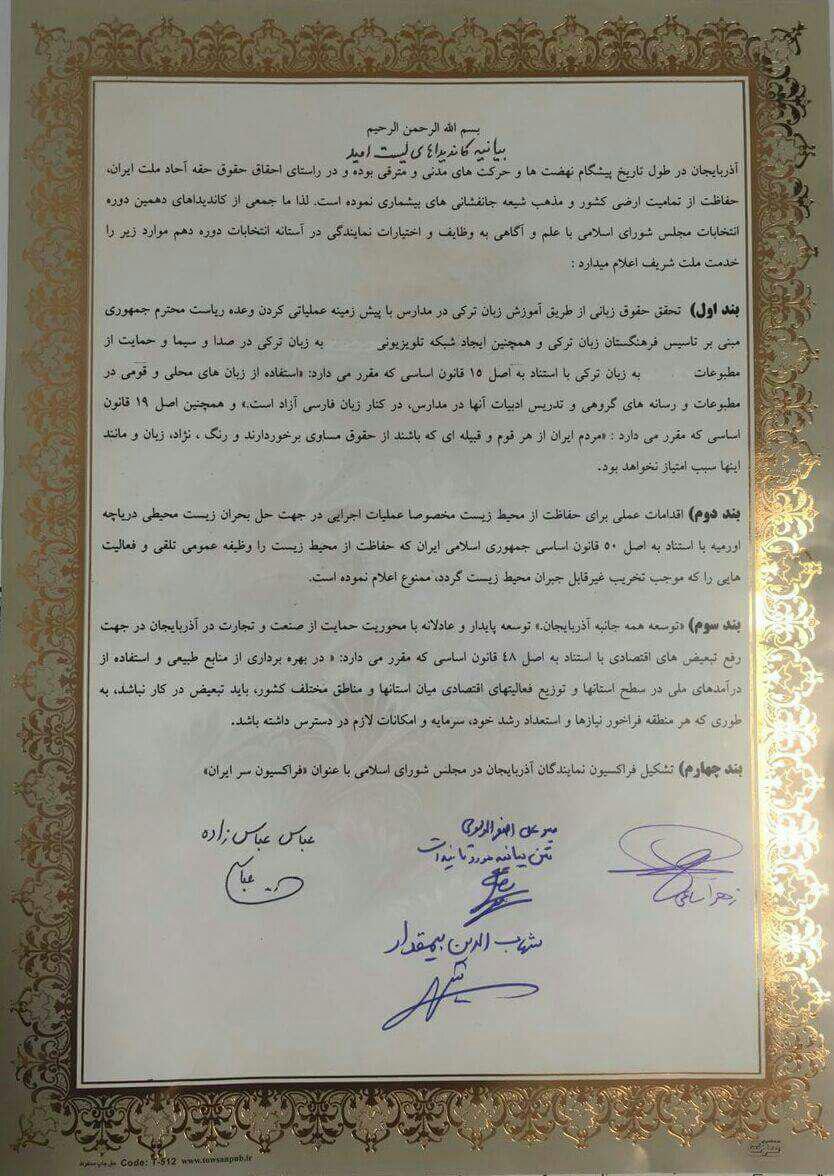 در بخش ابتدای بیانیه آمده است: « آذربایجان در طول تاریخ پیشگام نهضتها و حرکت های مدنی و مترقی بوده و در راستای احقاق حقوق حقه آحاد ملت ایران، حفاظت از تمامیت ارضی کشور و مذهب شیعه جانفشانی های بیشماری نموده است. لذا ما جمعی از کاندیداهای دهمین دوره انتخابات مجلس شورای اسلامی با علم و آگاهی به وظایف و اختیارات نمایندگی در آستانه انتخابات دوره دهم موارد زیر را خدمت ملت شریف اعلام میدارد»