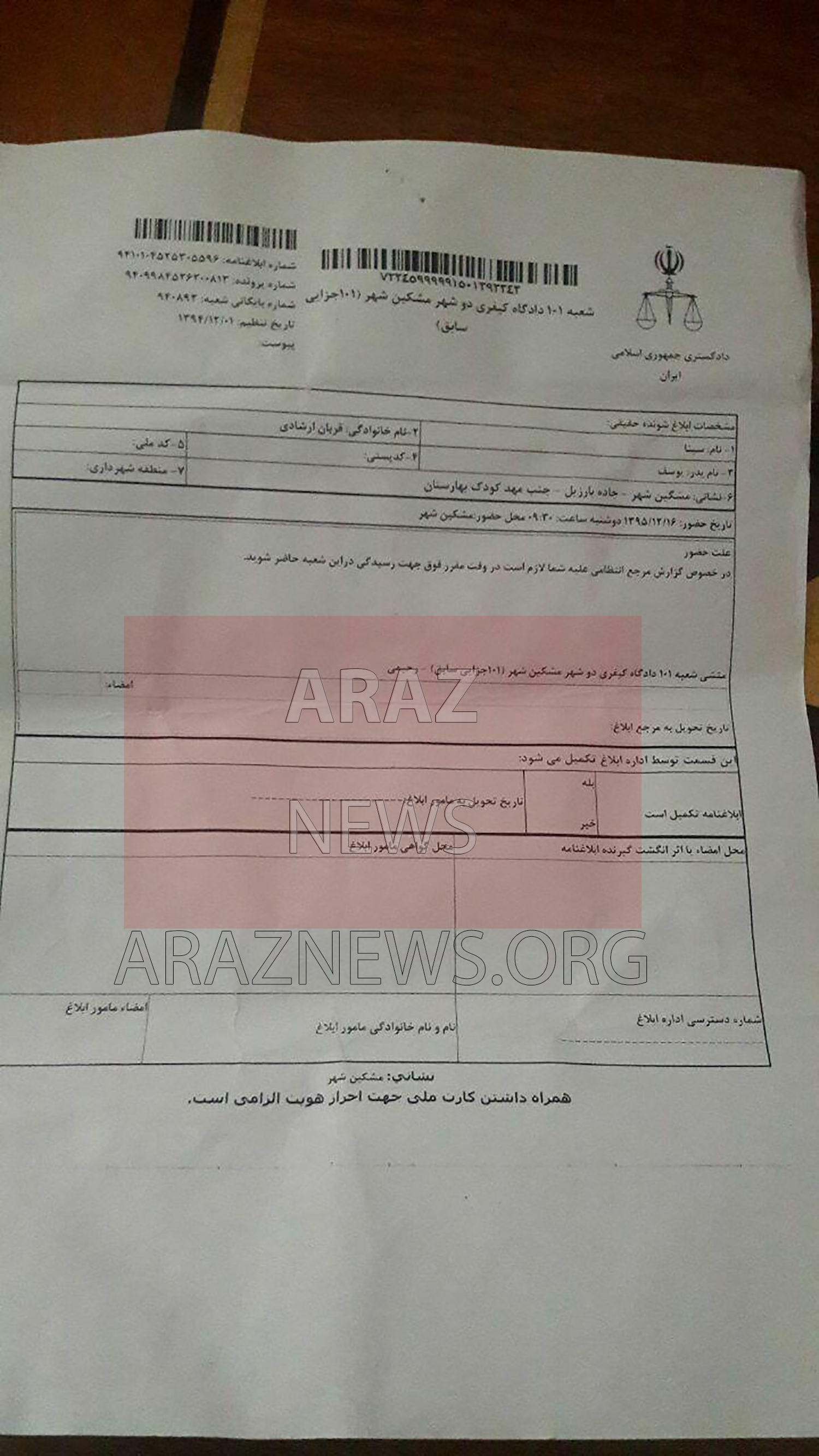 [box type="info" bg="#" color="#" border="#" radius="0"]فعال مدنی حرکت ملی آزربایجان سینا ارشادی اهل مشکین شهر (خیاو) به دادگاه این شهر احضار شد. [/box]بنا به اطلاع آراز نیوز؛ سینا ارشادی، فعال مدنی شهر مشکین شهر که در روز ۱۲مهرماه به ستاد خبری اداره اطلاعات این شهر احضار و پس از حضور در این ستاد خبری بازداشت شده بود، به علین آنچه که در احضارنامه «گزارش مرجع انتظامی» نوشته شده به دادگاه مشکین شهر احضار گردیده است.