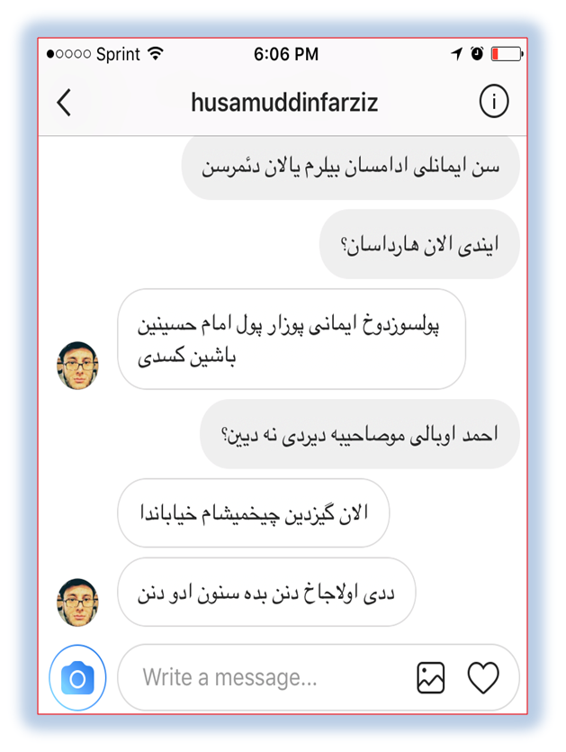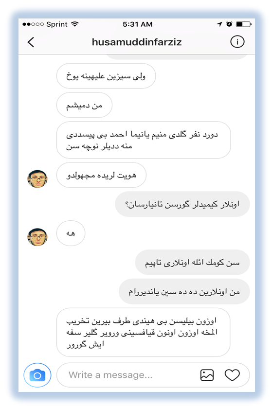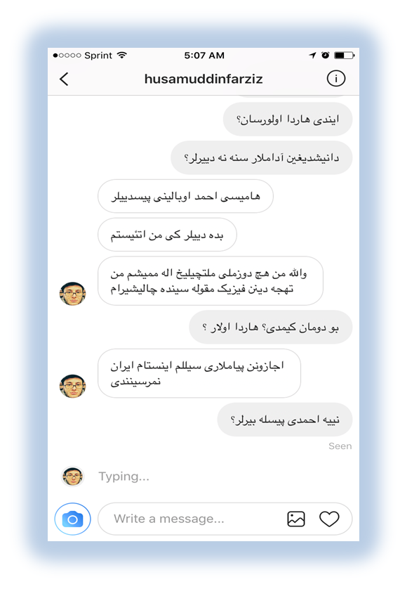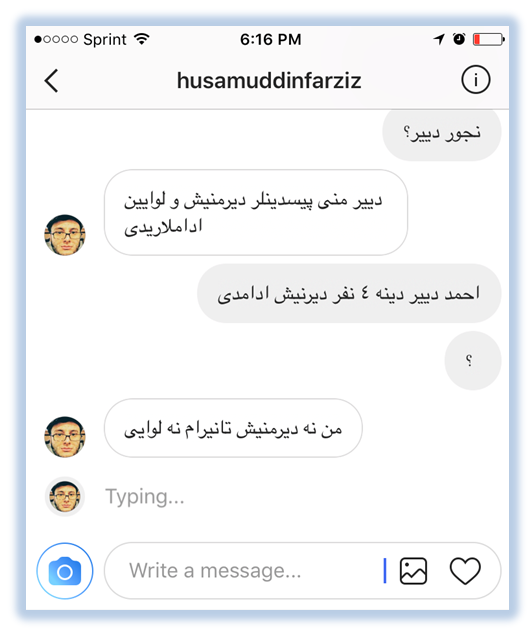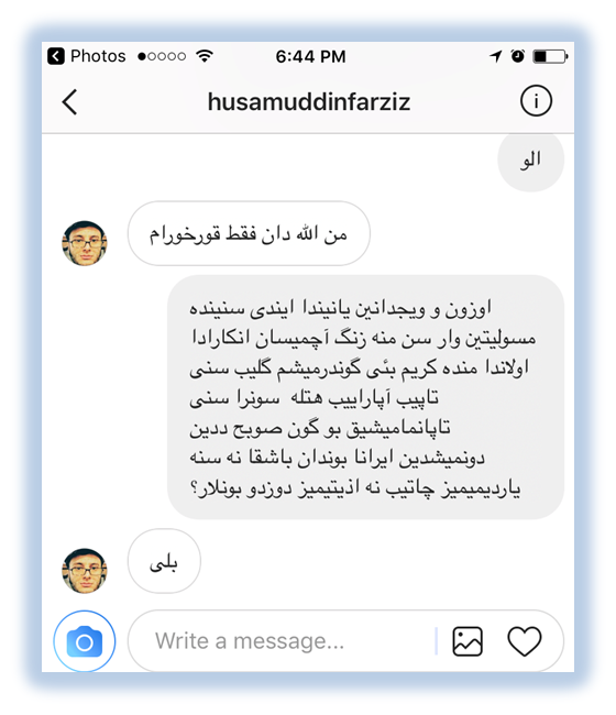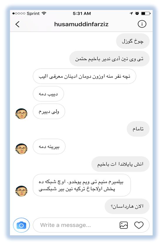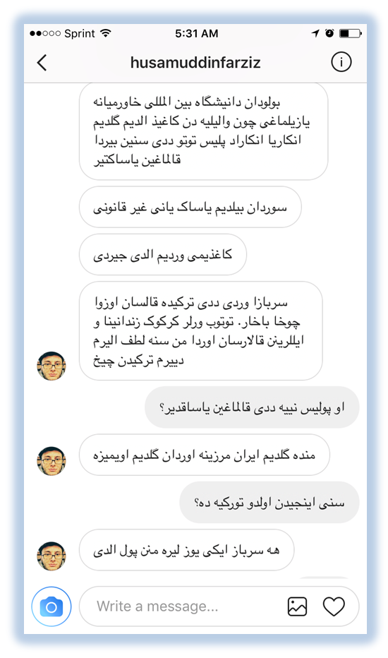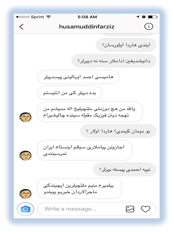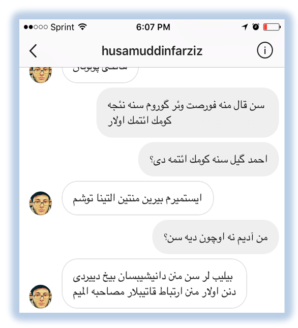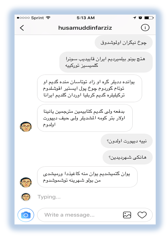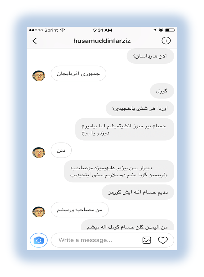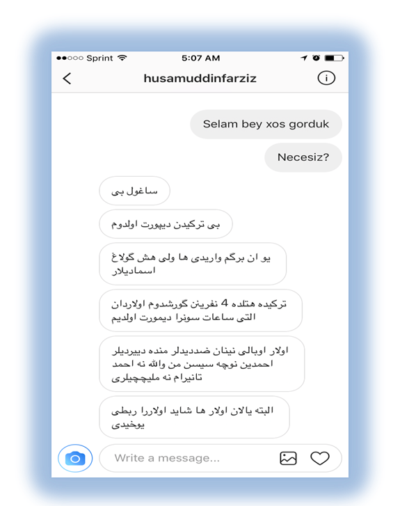 چهارشنبه ۲۶/۰۷/۲۰۱۷ گونو دوستوموز زنگ آچاندا آخشام گئج اولدوغو اوچون صاباحی یعنی جمعه آخشامی حسام الدین بیی اینترنتده آختاردیم و نهایت اینستاگرام حسابینی تاپدیم. سلام کئف احوالدان سونرا سوروشدوم بئله بیر قضیه وار سن بیزیم علیه میزه دانیشاجاقمیشسان، دوغرومو؟