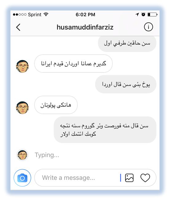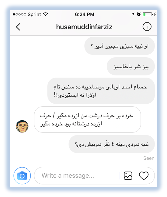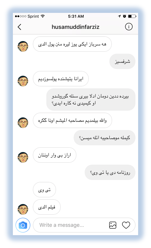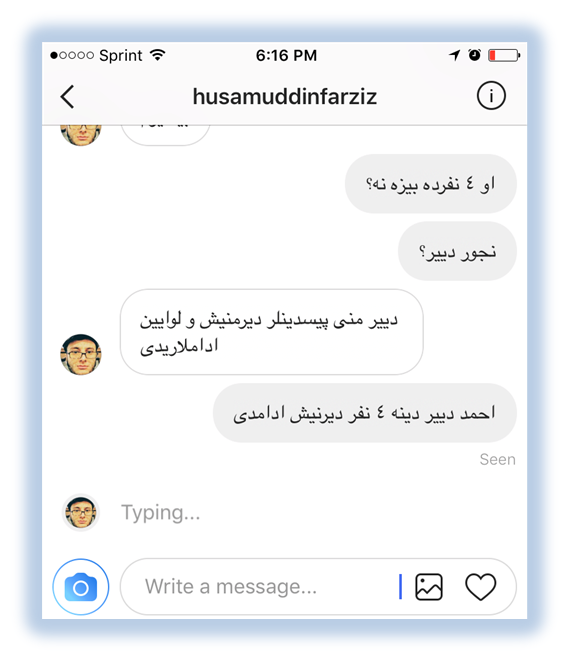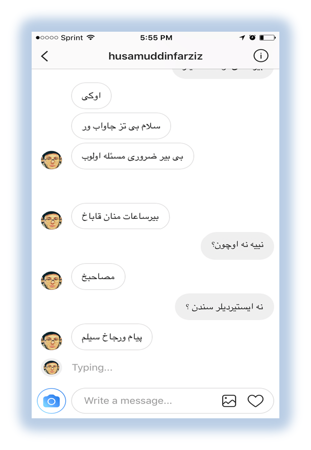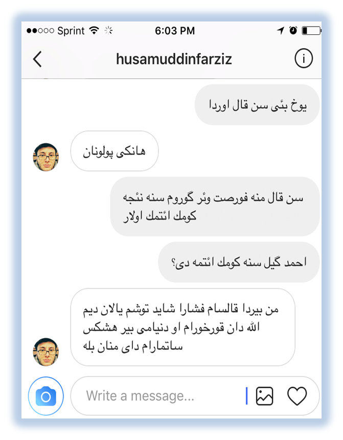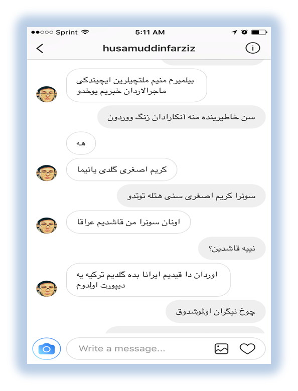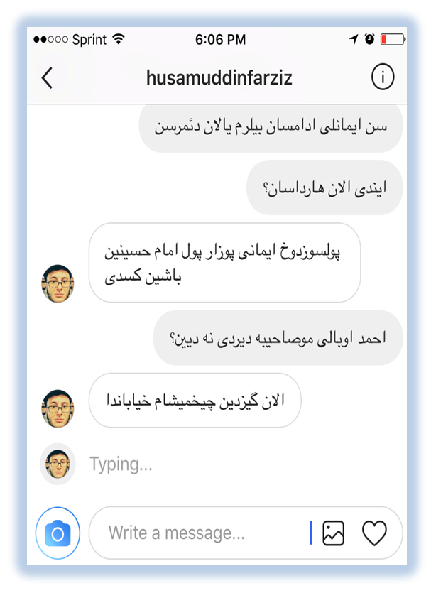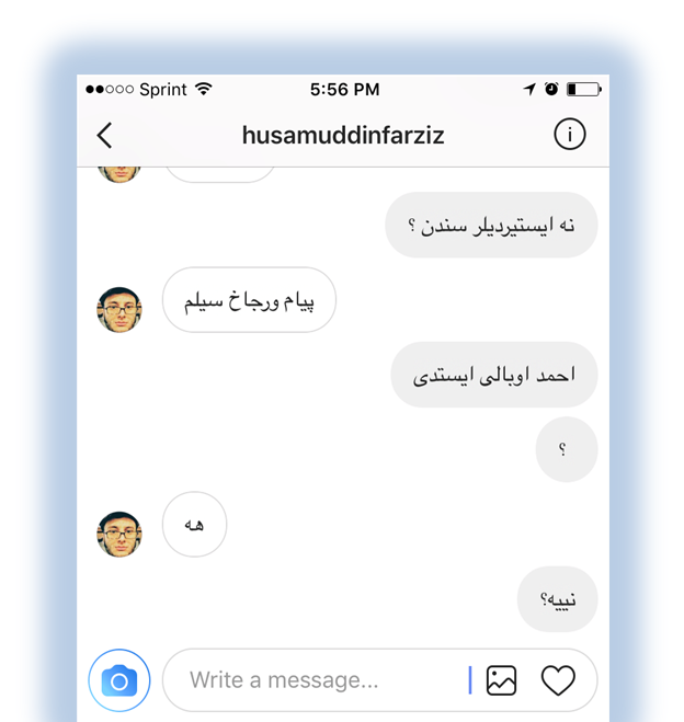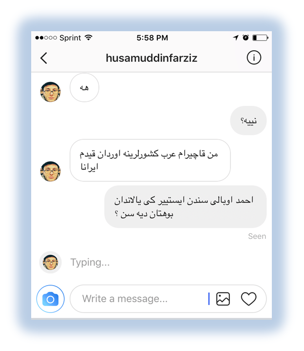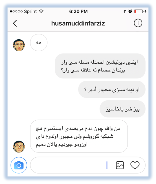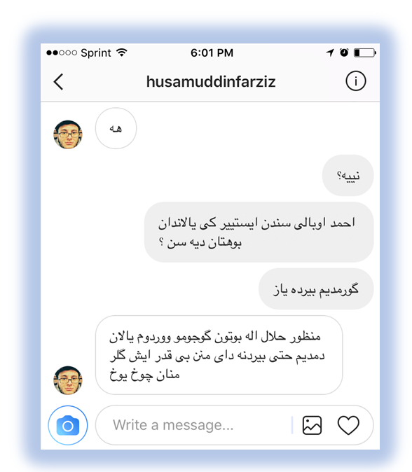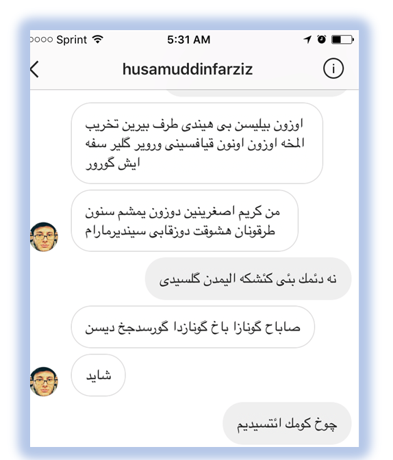 چهارشنبه ۲۶/۰۷/۲۰۱۷ گونو دوستوموز زنگ آچاندا آخشام گئج اولدوغو اوچون صاباحی یعنی جمعه آخشامی حسام الدین بیی اینترنتده آختاردیم و نهایت اینستاگرام حسابینی تاپدیم. سلام کئف احوالدان سونرا سوروشدوم بئله بیر قضیه وار سن بیزیم علیه میزه دانیشاجاقمیشسان، دوغرومو؟