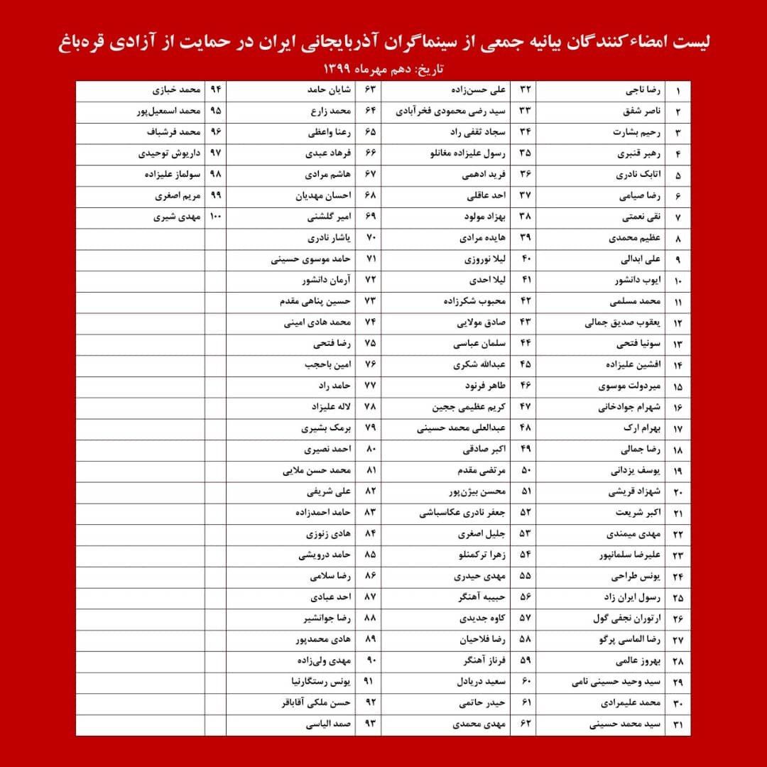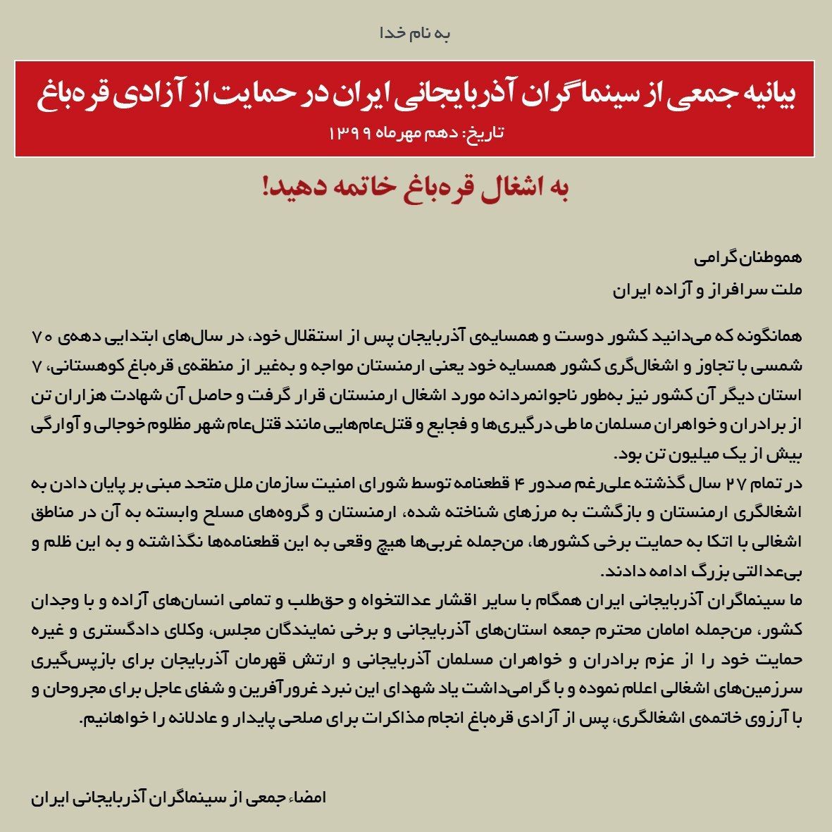 ما سینماگران آزربایجانی ایران همگام با سایر اقشار عدالتخواه و حقطلب و تمامی انسانهای آزاده و با وجدان کشور، منجمله امامان محترم جمعه استانهای آزربایجانی و برخی نمایندگان مجلس، وکلای دادگستری و غیره حمایت خود را از عزم برادران و خواهران مسلمان آزربایجانی و ارتش قهرمان آزربایجان برای بازپسگیری سرزمینهای اشغالی اعلام نموده و با گرامیداشت یاد شهدای این نبرد غرورآفرین و شفای عاجل برای مجروحان و با آرزوی خاتمهی اشغالگری، پس از آزادی قرهباغ انجام مذاکرات برای صلحی پایدار و عادلانه را خواهانیم.