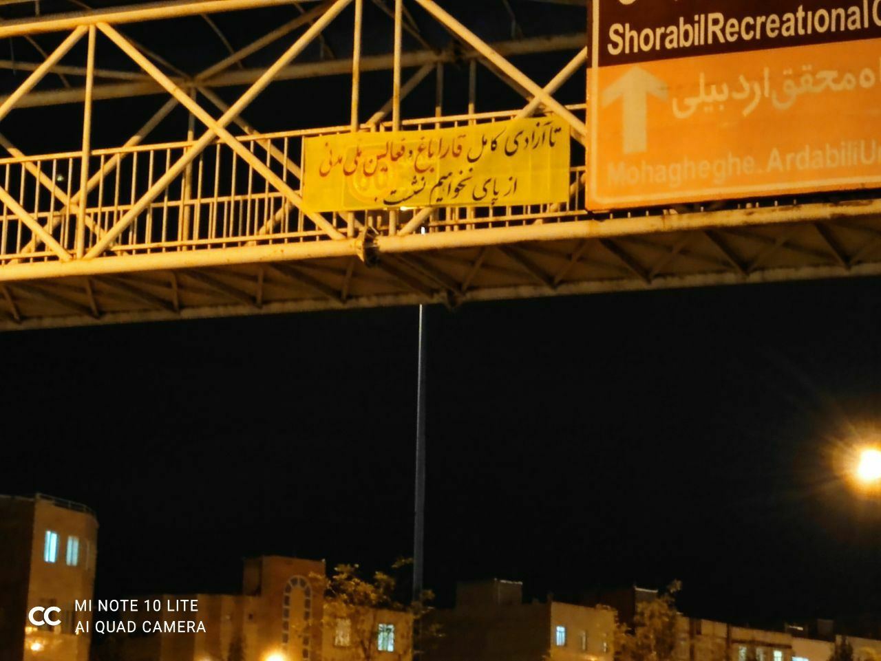 در این پارچه نوشته که بر روی یکی از پل های عابر پیاده در وسط شهر نصب شده است فعالین ملی مدنی اردبیلی همچنین خواهان آزادی تمامی دستگیر شدگام تجمعات روز ۱۰ مهر شدند.