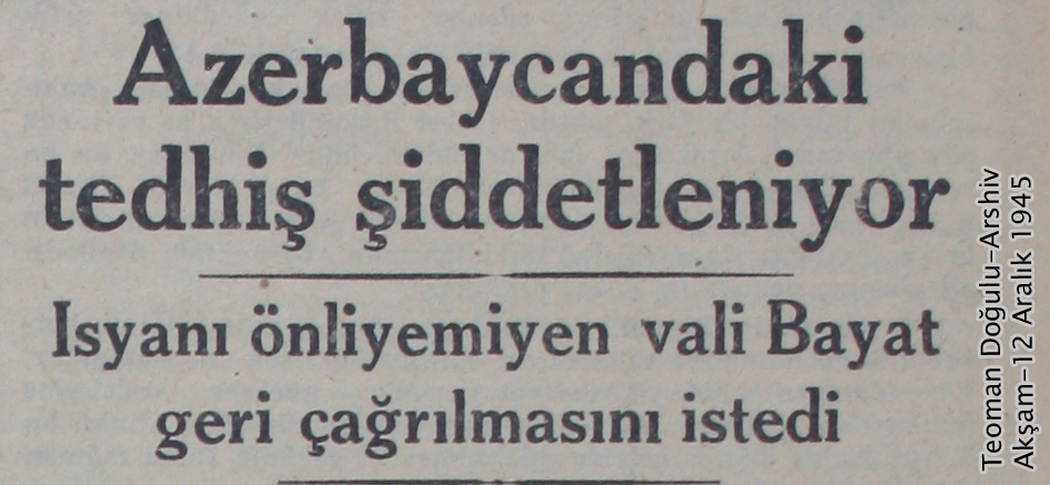 در شماره ی روز چهارشنبه دوازدهم دسامبر مصادف با 21 آذر 1324، روزنامه آکشام تیتر صفحه اول خود را به آزربایجان جنوبی اختصاص داده و از افزایش شدت قیام ملت آزربایجان خبر می دهد. مرتضی قلی بیات که از سوی تهران به ریاست استانداری آزربایجان منتصب و به تبریز فرستاده شده بود ، طبق گزارش آکشام بیات طی تلگرافی به تهران، خواستار سلب مسئولیت از وی و صدور اجازه بازگشت به تهران می شود.