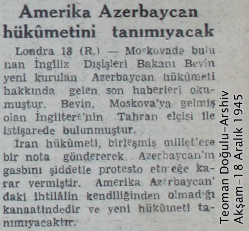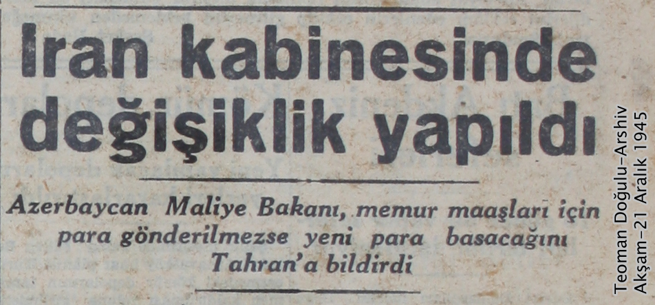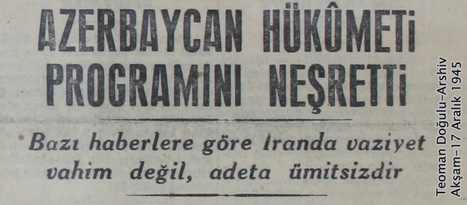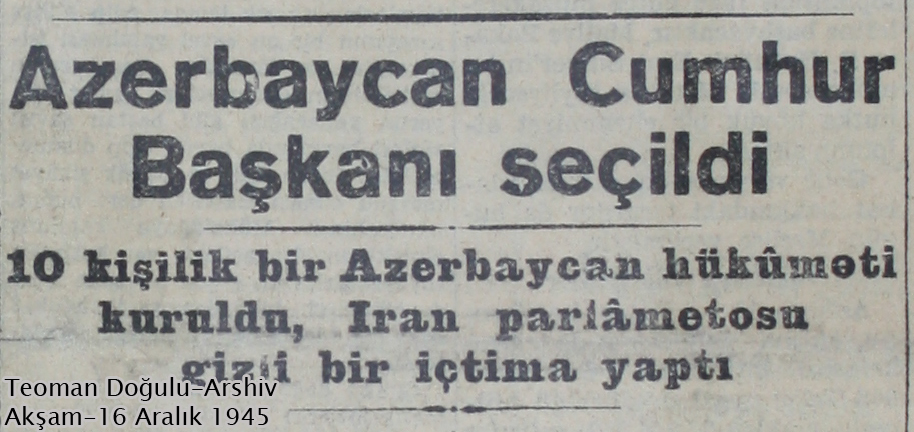 در شماره روز یکشنبه 16 دسامبر برابر با 25 آذرماه 1324، بنا به استناد روزنامه آکشام به خبرگزاری روسی”تاس”TASS ، حکومتی در آزربایجان تاسیس و رئیس حکومت نیز انتخاب شده است. بنا بر استناد روزنامه آکشام به این خبرگزاری رسمی روس نیروهای ارتش ایران رضایت به تسلیم سلاح های خود به حکومت تازه تاسیس آزربایجان داده اند.