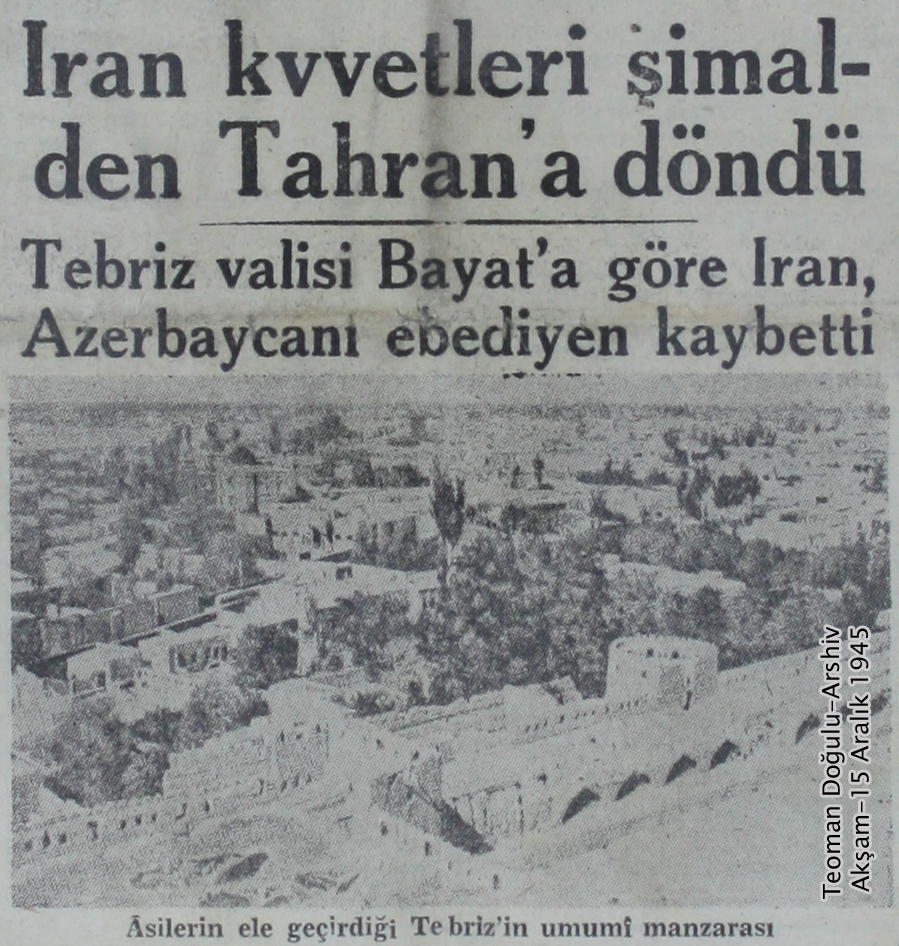 در شماره روز یکشنبه 16 دسامبر برابر با 25 آذرماه 1324، بنا به استناد روزنامه آکشام به خبرگزاری روسی”تاس”TASS ، حکومتی در آزربایجان تاسیس و رئیس حکومت نیز انتخاب شده است. بنا بر استناد روزنامه آکشام به این خبرگزاری رسمی روس نیروهای ارتش ایران رضایت به تسلیم سلاح های خود به حکومت تازه تاسیس آزربایجان داده اند.
