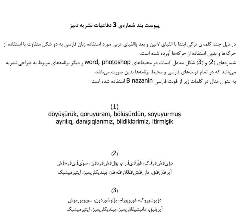 یاسر رنجبری، مدیرمسئول دنیز در دفاعیهای که به کمیته ناظر در رابطه با آییننامه نشریات در مورد الفبای مطالب غیر فارسی نوشته : «آیین نامه نشریات در رابطه با الفبای مطالب غیر فارسی منعی برای استفاده از الفبای لاتین ذکر نکرده است و از آنجاییکه الفبای عربی مورد استفاده زبان فارسی فاقد حروفی برای برخی از اصوات زبان ترکی میباشد، استفاده از این الفبا برای آموزش زبان ترکی به دلیل مشکلات خاص چاپی و تایپی و نیز سردرگمی مخاطبان چندان مناسب نمیباشد. با این حال نشریه دنیز از الفبای لاتین، صرفا برای آموزش زبان «ترکی آذربایجانی» استفاده میکند.مثلا: به هنگام استفاده از الفبای عربی مورد استفاده زبان فارسی، برای نوشتار زبان ترکی، کلمهی ترکی «دوز» به چهار شکل «doz,döz,duz,düz» خوانده میشود که هر کدام از این کلمات دارای معانی خاصی در زبان ترکی میباشند. وجود مشکلات بیشماری از این قبیل، ما را به استفاده از الفبای لاتین برای «آموزش زبان ترکی آذربایجانی» وا میدارد.»
