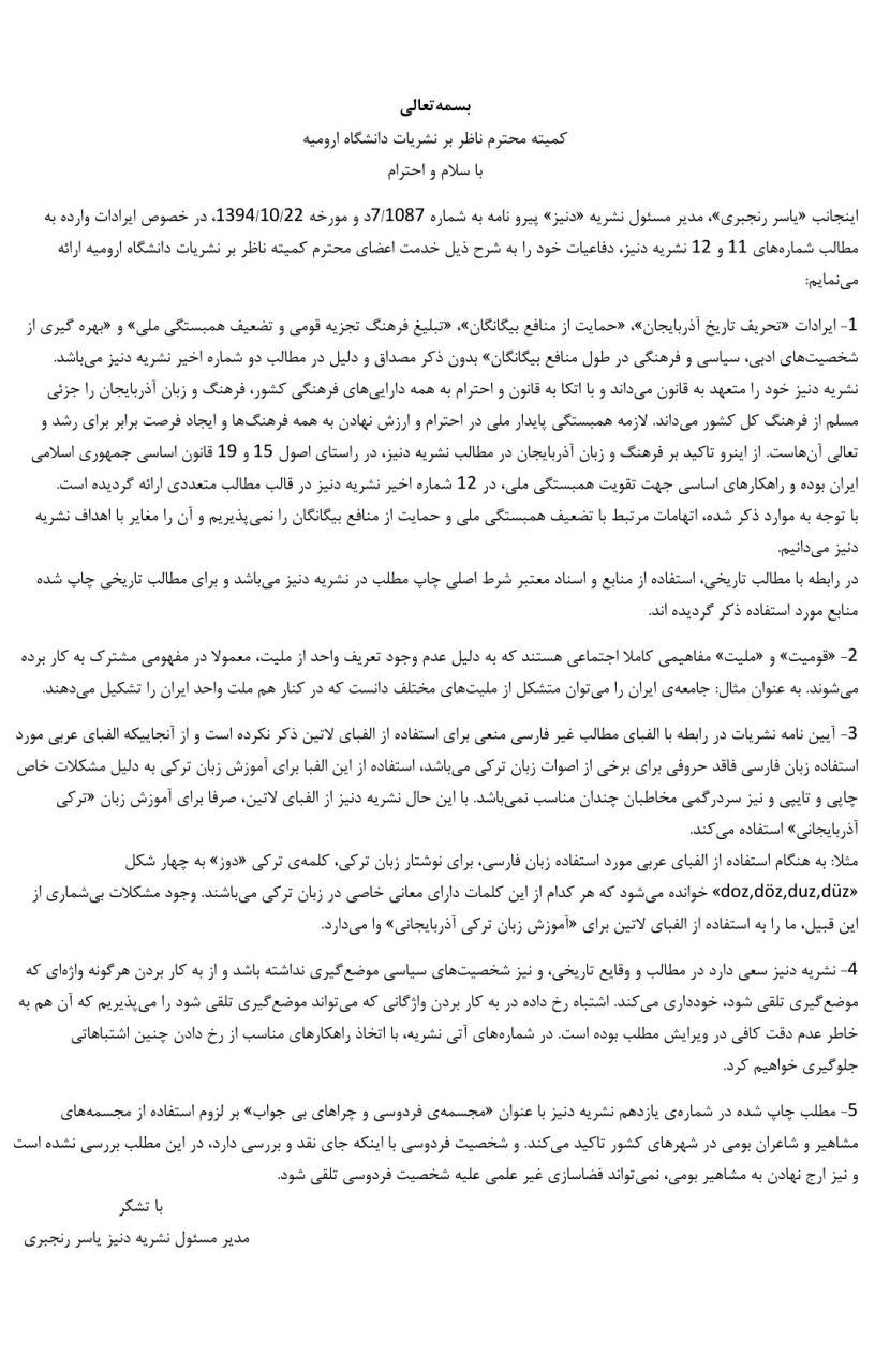 وی ادامه میدهد:«بررسی نشریه دنیز به جلسه دیگری موکول میشود و در این جلسه از یک زبانشناس دعوت به عمل آمده بود تا مطالب ترکی دو شماره اخر نشریه دنیز را بررسی کند. که با توجه به چاپ تصویر آتاتورک در جلد نشریه و برخی مطالب تورکی بعد از اتمام جلسه نامهای از این نشریه برایم ارسال شد که نشریه را با ذکر ایراداتی به مدت ۶ ماه به تعلیق درمیآورد.»