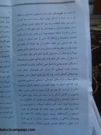 در این بروشورها آمده است: "آیا حذف نام بلوچستان در دفترچه های درمانی و سربرگ های اداری عمدی نبود ؟ و به دنبال آن مخدوش کردن تابلو های بلوار بلوچستان و به دنبال آن حذف کلی تابلوها از بلوار مذکور عملی بسیار قبیحانه و غیر قابل چشم پوشی به شمار نمی آید؟ و در پایان و در هفته وحدت نصب بنر های که در آن نام بلوچستان حذف شده بود غیر قابل اغماض است"