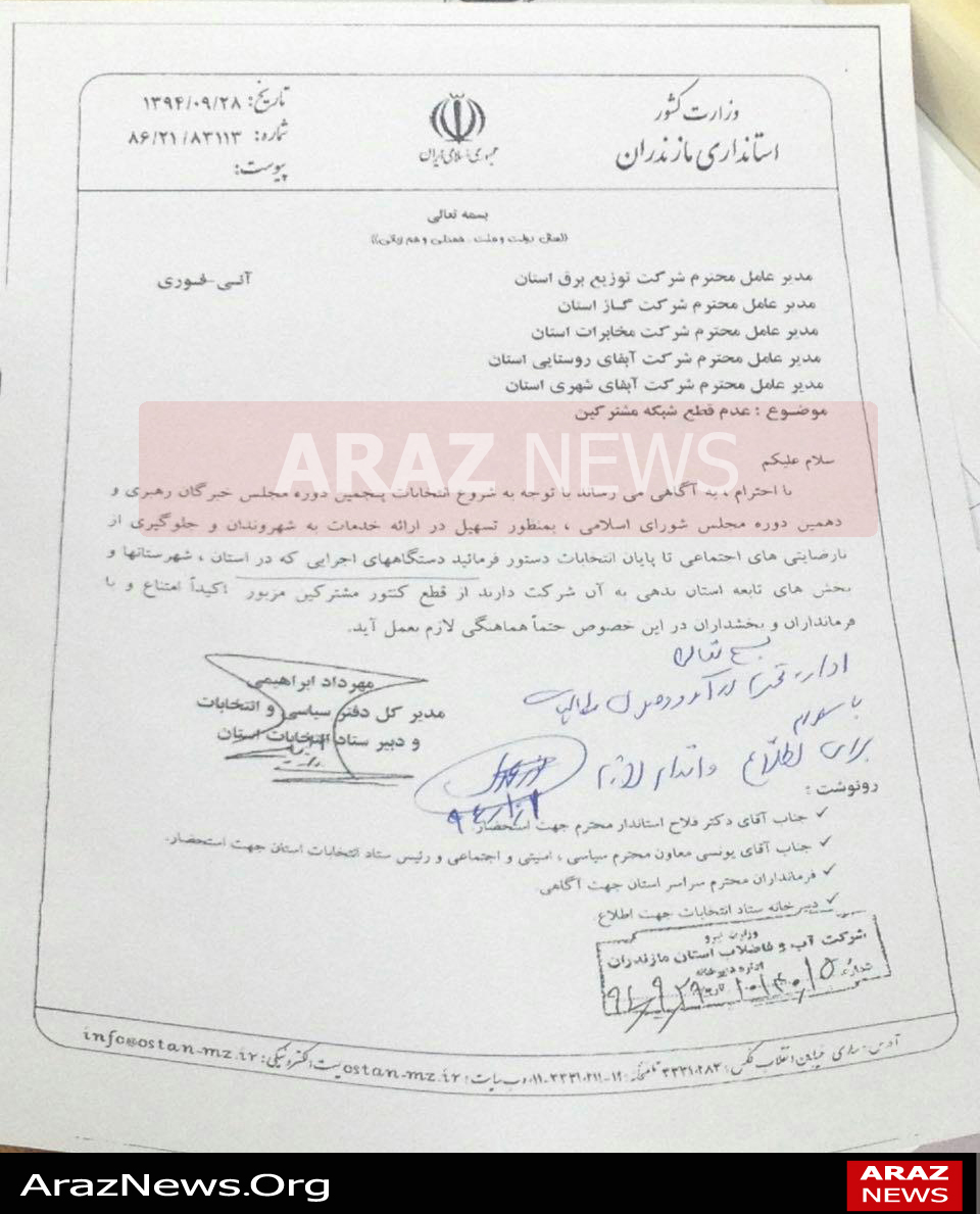 استانداری استان مازندران طی نامهای به شرکتهای برق، گاز، آب و فاضلاب و مخابرات از آنها خواسته است تا پایان انتخابات و رای گیری از قطع کنتور مشترکین خودداری نمایند.