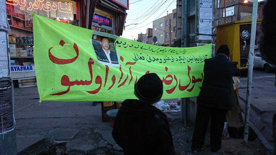 فعالین مدنی آزربایجان با نصب پارچه نوشته ای خواستار آزادی رسول رضوی، فعال مدنی محبوس آزربایجانی از زندان شدند.