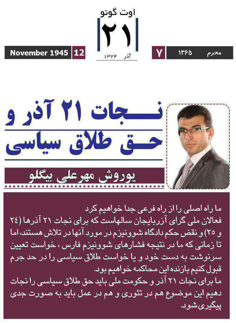 فعالان ملی گرای آزربایجان سالهاست که برای نجات ۲۱ آذرها (۲۴ و ۲۵) و نقض حکم دادگاه شوونیزم در مورد آنها در تلاش هستند، اما تا زمانی که ما در نتیجه فشارهای شوونیزم فارس ، خواست تعیین سرنوشت به دست خود و یا خواست طلاق سیاسی را در حد جرم قبول کنیم بازنده این محاکمه خواهیم بود.