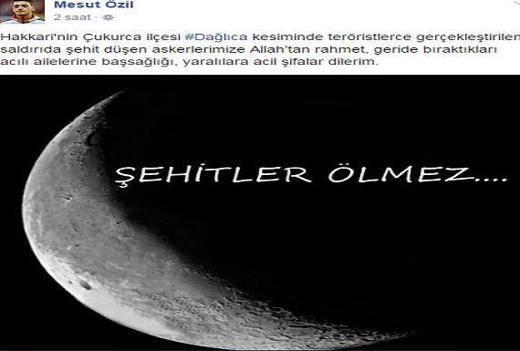 مسعود اوزیل، ستارهی ترکتبار تیم ملی فوتبال آلمان و تیم فوتبال آرسنال انگلیس با انتشار پیامی در صفحه رسمی فیس بوک خود شهادت سربازان ارتش ترکیه را تسلیت گفت.