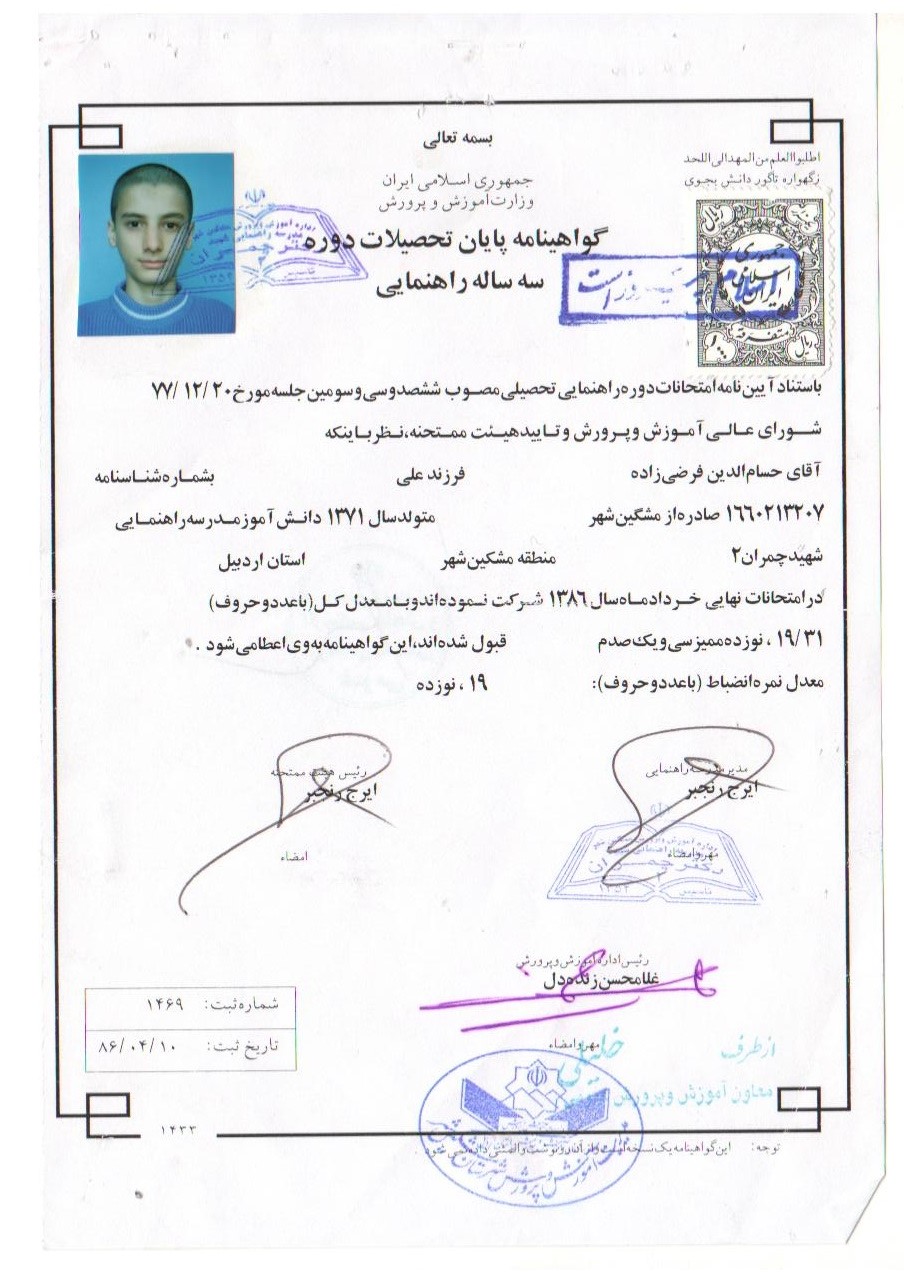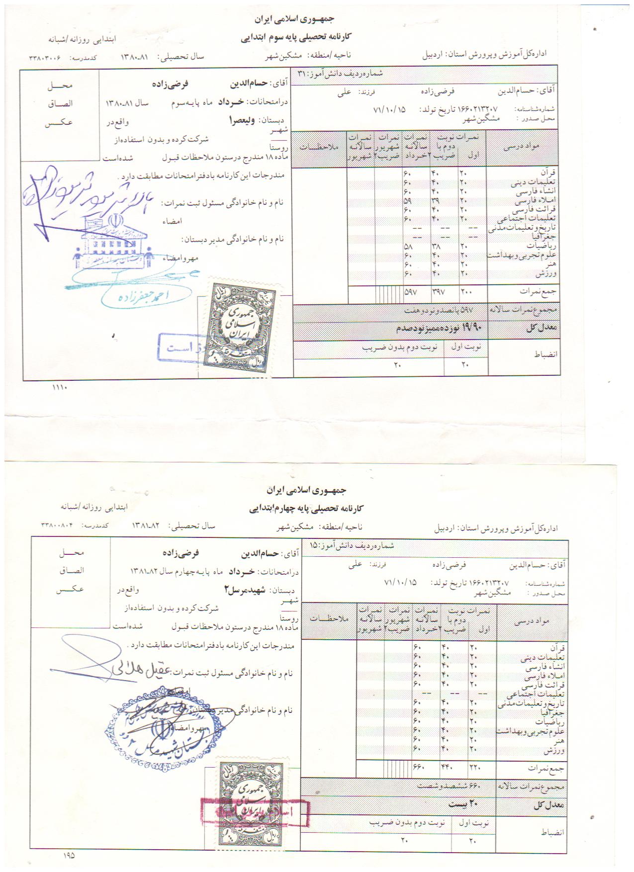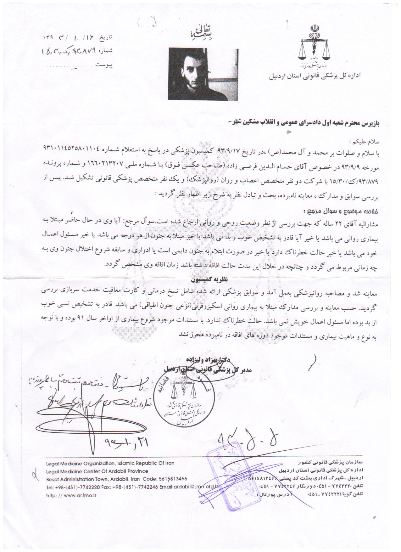 طبق این گزارش حسام الدین فرضی زاده دارای مقالات ISI در رشته فیزیک میباشد و همچنین دعوتنامهای از دانشگاه استنفورد دریافت کرده است. وی دوران تحصیل خود را با نمرات عالی گذرانده است که اخیرا با نوشتن کتابی در مورد اسلام و نشر عقاید خود محکوم به اعدام شده است. وی در دفاعیه خود در دادگاه مشکین شهر اظهار داشته که: «اتهامات را قبول ندارم زیرا هدف بنده از نوشتن کتاب ارائه نظر خود جهت نقد از طرف سایرین بود و مطالبی که بنده در کتاب مذکور نوشته ام همگی مطالبی مستند است که اینجانب گردآوری نمودم و سپس جهت نشر در فضای علمی اقدام به نشر آن نمودم تا تبادل فکر بنمایم.»