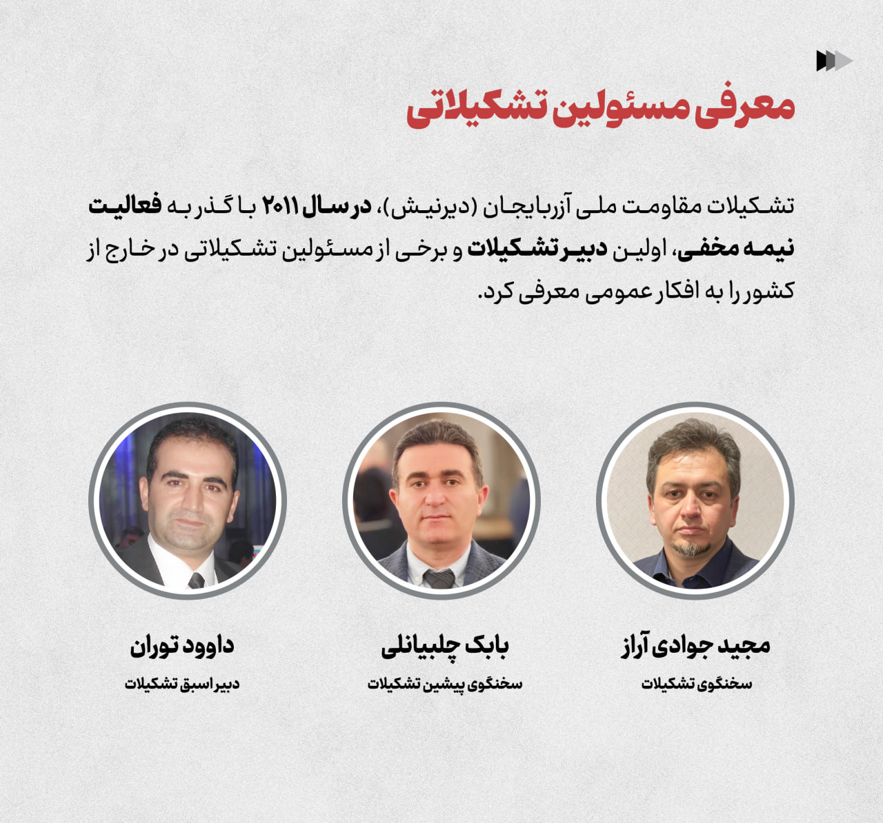تشکیلات مقاومت ملی آزربایجان (دیرنیش)، در سال ۲۰۱۱ با گذر به فعالیت نیمه مخفی، اولین دبیر تشکیلات و برخی از مسئولین تشکیلاتی در خارج از کشور را به افکار عمومی معرفی کرد.