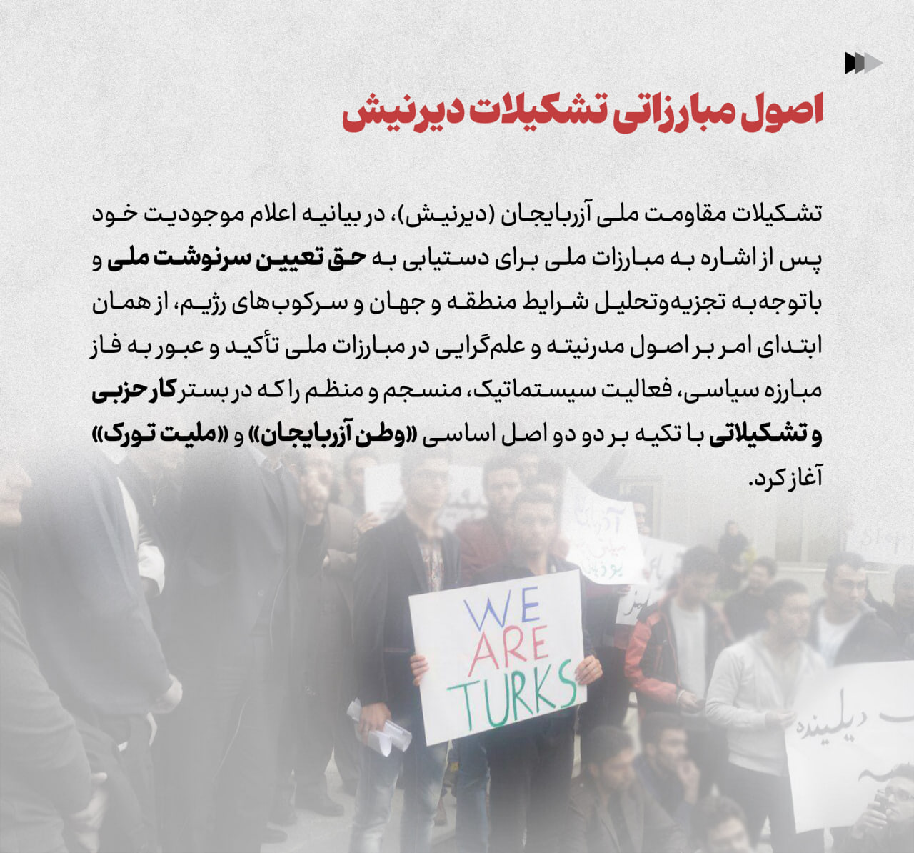 تشکیلات مقاومت ملی آزربایجان (دیرنیش)، در بیانیه اعلام موجودیت خود پس از اشاره به مبارزات ملی برای دستیابی به حق تعیین سرنوشت ملی و باتوجهبه تجزیهوتحلیل شرایط منطقه و جهان و سرکوبهای رژیم، از همان ابتدای امر بر اصول مدرنیته و علمگرایی در مبارزات ملی تأکید و عبور به فاز مبارزه سیاسی، فعالیت سیستماتیک، منسجم و منظم را که در بستر کار حزبی و تشکیلاتی با تکیه بر دو دو اصل اساسی «وطن آزربایجان» و «ملیت تورک» آغاز کرد.