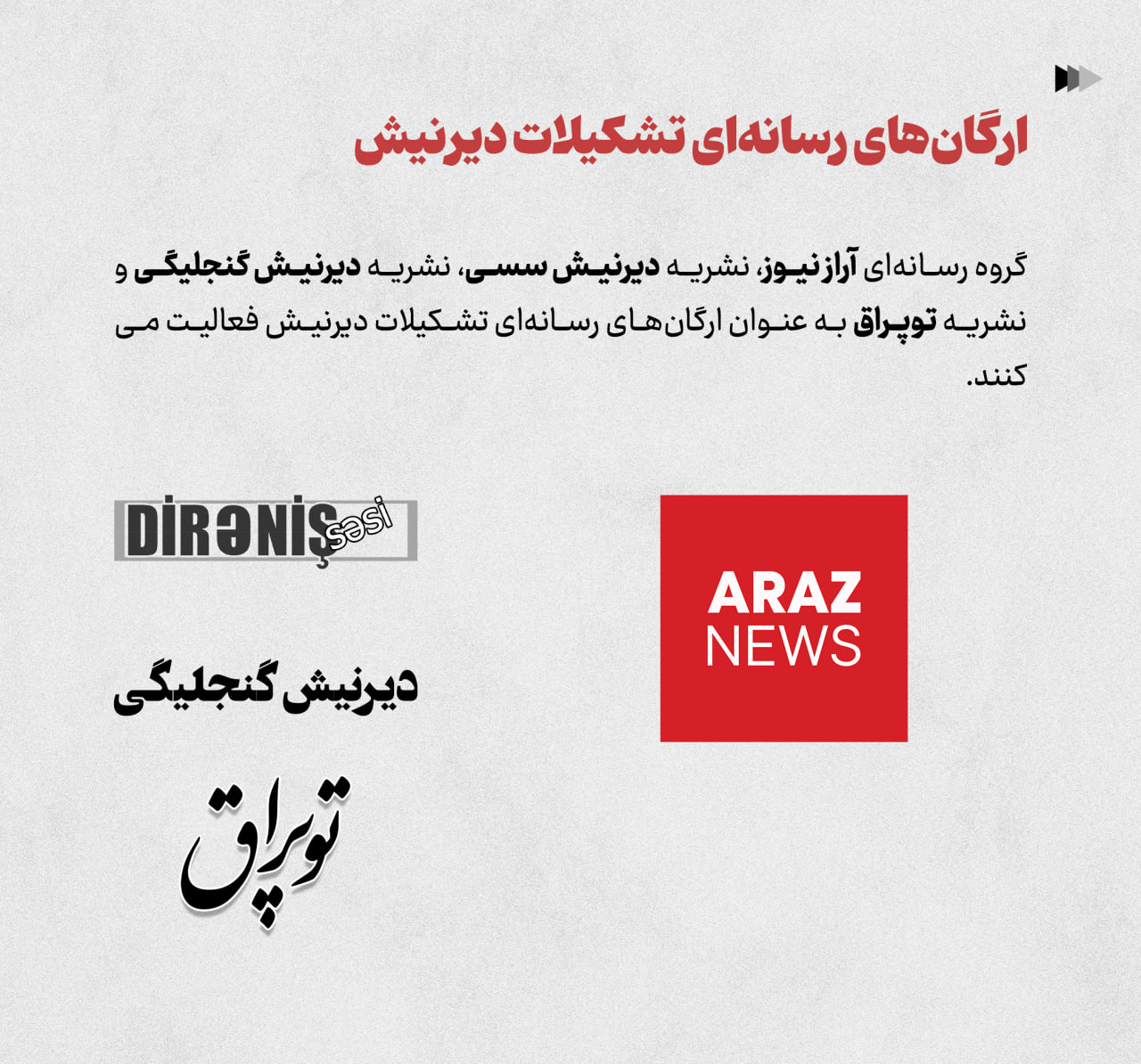 گروه رسانهای آراز نیوز، نشریه دیرنیش سسی، نشریه دیرنیش گنجلیگی و نشریه توپراق به عنوان ارگانهای رسانهای تشکیلات دیرنیش فعالیت میکنند.