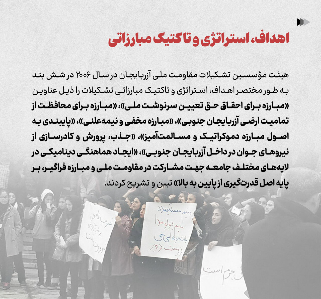 هیئت مؤسسین تشکیلات مقاومت ملی آزربایجان در سال ۲۰۰۶ در شش بند به طور مختصر اهداف، استراتژی و تاکتیک مبارزاتی تشکیلات را ذیل عناوین «مبارزه برای احقاق حق تعیین سرنوشت ملی»، «مبارزه برای محافظت از تمامیت ارضی آزربایجان جنوبی»، «مبارزه مخفی و نیمهعلنی»، «پایبندی به اصول مبارزه دموکراتیک و مسالمتآمیز»، «جذب، پرورش و کادرسازی از نیروهای جوان در داخل آزربایجان جنوبی»، «ایجاد هماهنگی دینامیکی در لایههای مختلف جامعه جهت مشارکت در مقاومت ملی و مبارزه فراگیر، بر پایه اصل قدرتگیری از پایین به بالا» تبین و تشریح کردند.