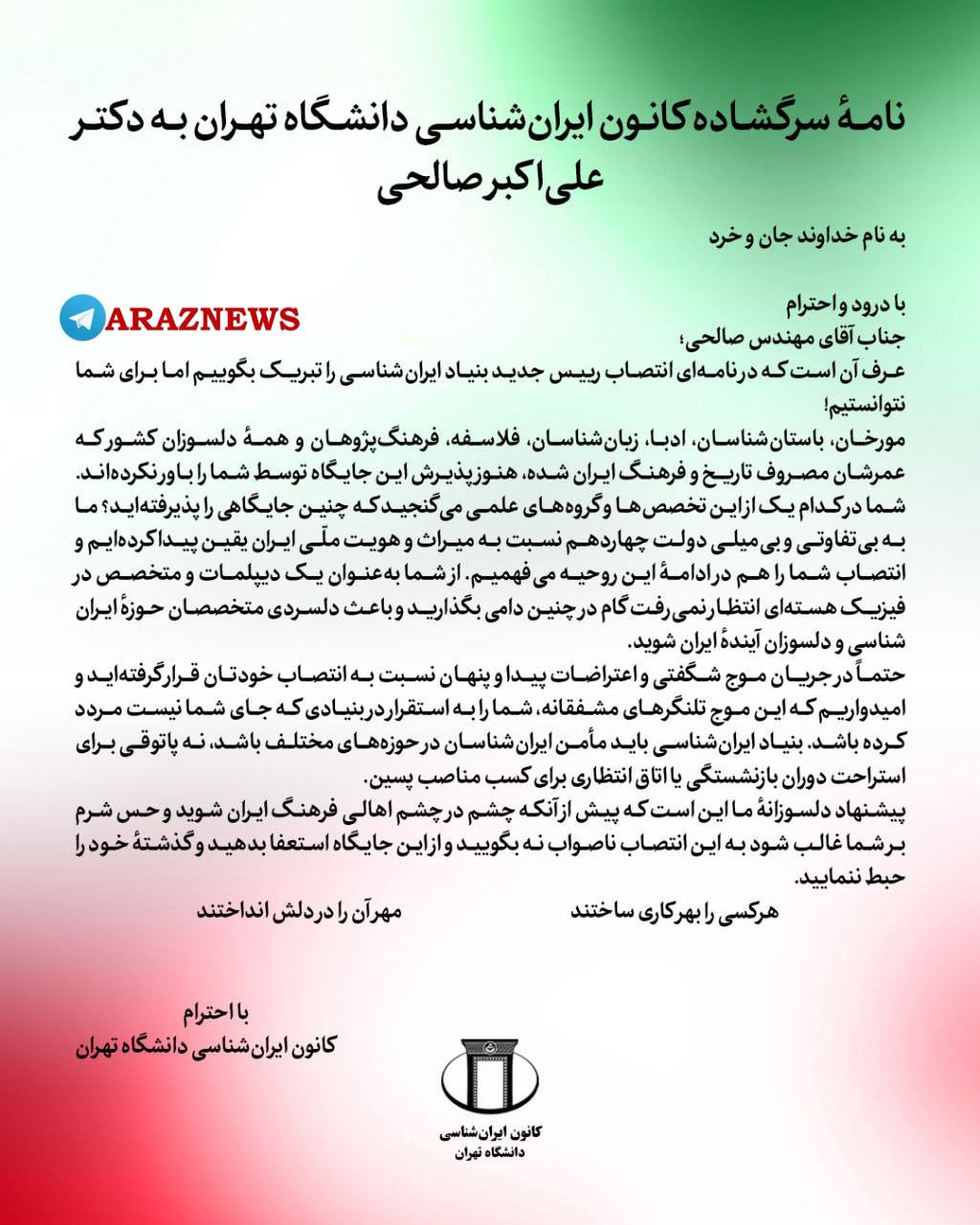 کانون ایرانشناسی دانشگاه تهران در نامه اش نوشته است «یقین» دارد که دولت مسعود پزشکیان نسبت به میراث و هویت ملی ایران، «بیتفاوت و بیمیل» است، اما از صالحی بهعنوان یک دیپلمات و متخصص در فیزیک هستهای «انتظار نمیرفت گام در چنین دامی» بگذارد.