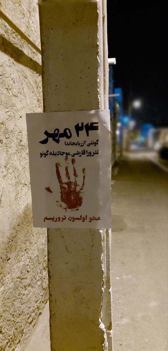 فعالین حرکت ملی آزربایجان در سالگرد ۲۴ مهر، با نصب پوسترهایی در اورمیه، حمایت جمهوری اسلامی از گروههای تروریستی در غرب آزربایجان را محکوم کردند.