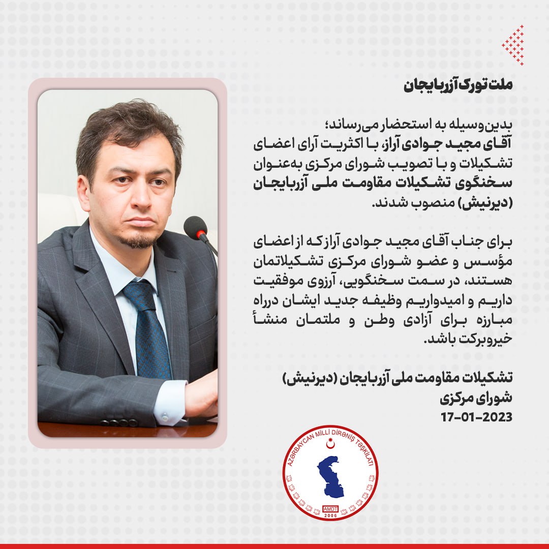 آقای مجید جوادی آراز به عنوان سخنگوی تشکیلات مقاومت ملی آزربایجان تعیین شد