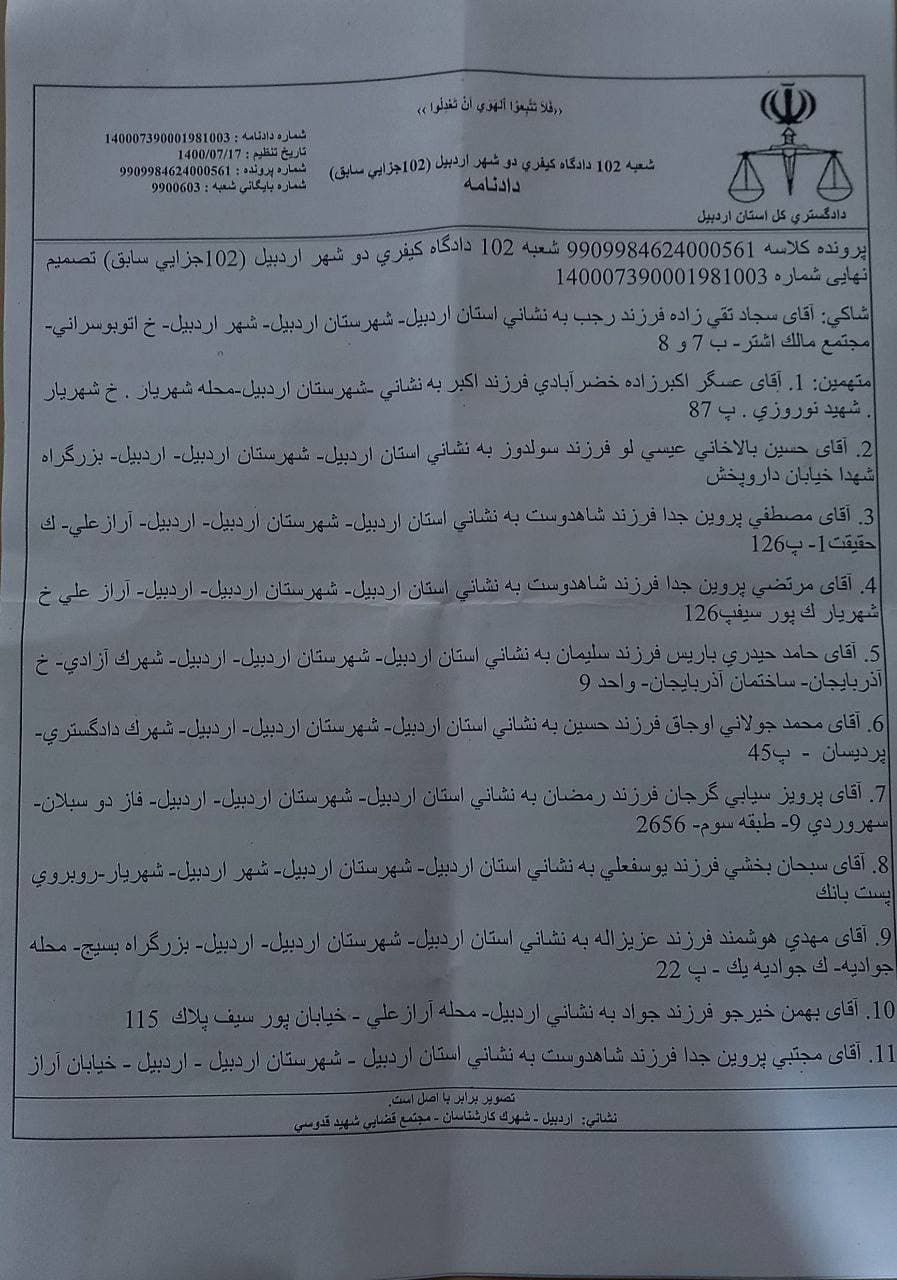 شعبه ۱۰۲ دادگاه کیفری ۲ شهر اردبیل با تصدی طاهر رسولی طی حکمی که از طریق سامانه ثنا دیروز ۱۷ مهر ۱۴۰۰ ابلاغ نموده، هر یک از فعالین ملی و مدنی بازداشت شده در پارک جیرال اردبیل در حمایت از آزادسازی قاراباغ به اسامی «پرویز سیابی»، «حسین بالاخانی»، «عسگر اکبرزاده»، «مصطفی پروین»، «مرتضی پروین»، «مجتبی پروین»، «حامد حیدری»، «محمد جولانی»، «سبحان بخشی»، «مهدی هوشمند»، «بهمن خیرجو» و «سجاد جولانی» را با لحاظ مقررات تعدد جرم از بابت اتهام تمرد نسبت به مأمورین انتظامی حین انجام وظیفه با استناد به ماده ۶۰۷ کتاب پنجم قانون مجازات اسلامی -مبحث تعزیرات به تحمل ۷ ماه و ۱۶ روز حبس تعزیری و از بابت اتهام مشارکت در اخلال در نظم عمومی از طریق ایجاد هیاهو و جنجال با استناد به ماده ۶۱۸ همان قانون به تحمل ۷ ماه و ۱۶ روز حبس تعزیری و ۷۴ ضربه شلاق تعزیری مبادرت به صدور رأی محکومیت کرده است.