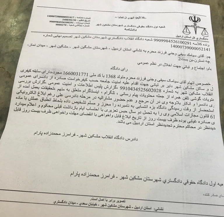 سیامک سیفی فعال ملی مدنی آذربایجانی ساکن مشگین شهر طی ابلاغیه ی دریافتی که تاریخ تنظیم آن ۱۴۰۰/۰۲/۳۰ میباشد با اتهام «اجتماع و تبانی جهت اخلال در نظم عمومی» به ۲ سال حبس تعزیری محکوم شده است.