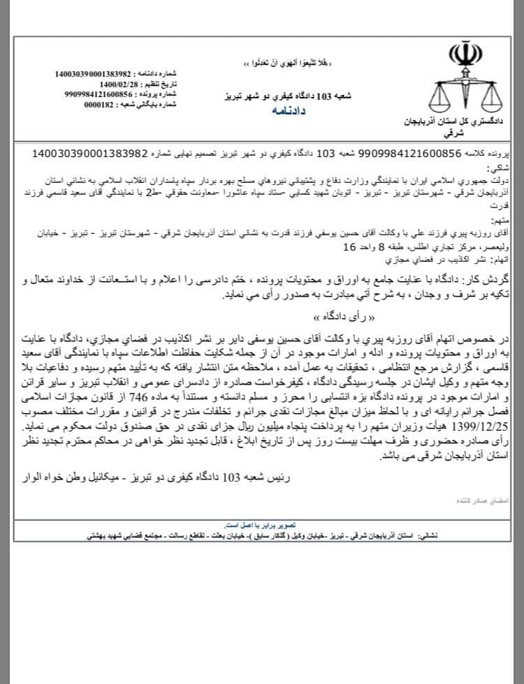 بر اساس دادنامه صادره توسط شعبه ۱۰۳ دادگاه کیفری دو تبریز به ریاست میکائیل وطن خواه صادر و به حسین یوسفی وکیل آقای پیری ابلاغ شده است، این فعال آذربایجانی به اتهام نشر اکاذیب در فضای مجازی مستندا به ماده ۷۴۶ از قانون مجازات اسلامی فصل جرائم رایانه ای به پنجاه میلیون ریال جزای نقدی محکوم شده است.