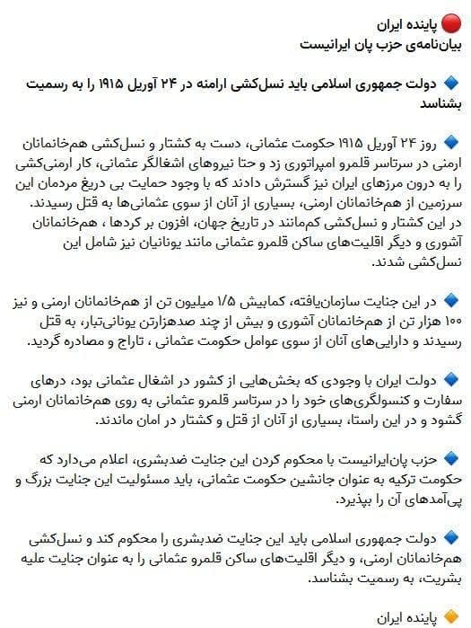 ﺣﺰﺏ ﻓﺎﺷﯿﺴﺘﯽ «ﭘﺎﻥﺍﯾﺮﺍﻧﯿﺴت» ﮐﻪ ﺁﺯﺍﺩﺍﻧﻪ ﺩﺭ ﺍﯾﺮﺍﻥ ﺑﻪ ﻓﻌﺎﻟﯿﺖ ﻣﯽﭘﺮﺩﺍﺯﺩ، ﻃﯽ ﺑﯿﺎﻧﯿﻪﺍﯼ ﺭﺳﻤﯽ، ﺧﻮﺍﺳﺘﺎﺭ ﺑﻪ ﺭﺳﻤﯿﺖ ﺷﻨﺎخته شدن دروغها و ادعاهای جعلی ارامنه ﺍﺯ ﺳﻮﯼ ﺩﻭﻟﺖ ﺟﻤﻬﻮﺭﯼ ﺍﺳﻼﻣﯽ ﺑﻪ ﻋﻨﻮﺍﻥ ﻧﺴﻞﮐﺸﯽ ﺷﺪﻩ ﺍﺳﺖ.