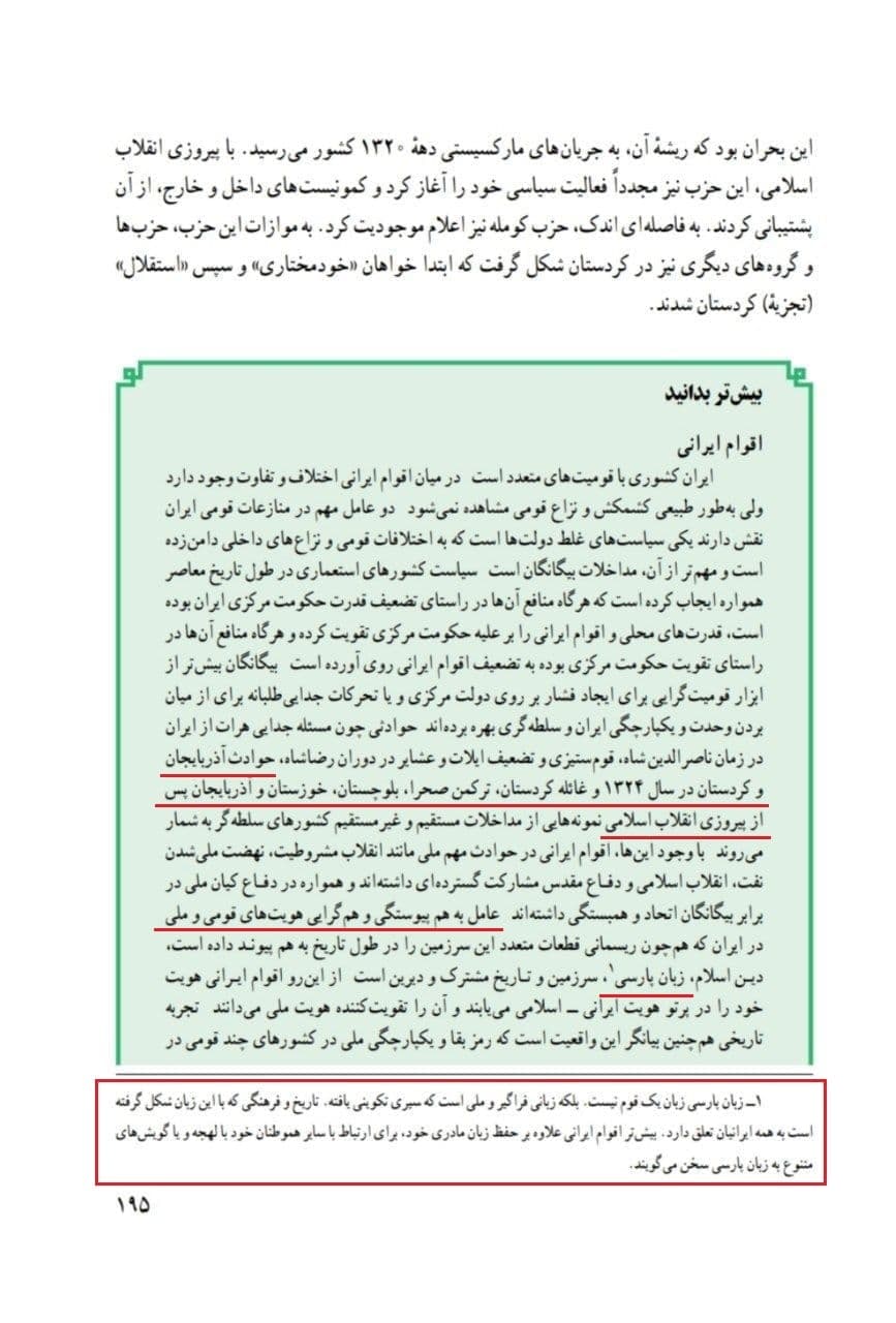در کتاب تاریخ معاصر دوره دبیرستان کلاس یازدهم نوشته شده است «پارسی زبان یک قوم نیست بلکه زبان فراگیر و ملی است ... بیشتر اقوام ایرانی علاوه بر حفظ زبان مادری خود ... با لهجه و گویشهای متنوع به زبان پارسی سخن میگویند» و فوقاً نیز زبان فارسی را یکی از عوامل «به هم پیوستگی و همگرایی» معرفی میکند.