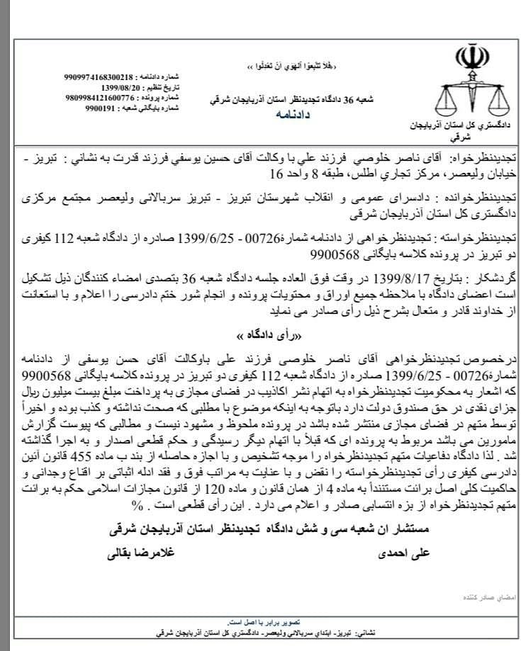 دادگاه تجدید نظر شعبه ۳۶ تبریز در خصوص اتهام نشر اکاذیب حکم ۲ میلیون جریمه نقدی دادگاه بدوی شعبه ۱۱۲ کیفری را فاقد ادله دانسته و حکم بر برائت داده است.