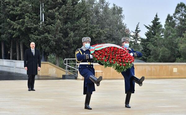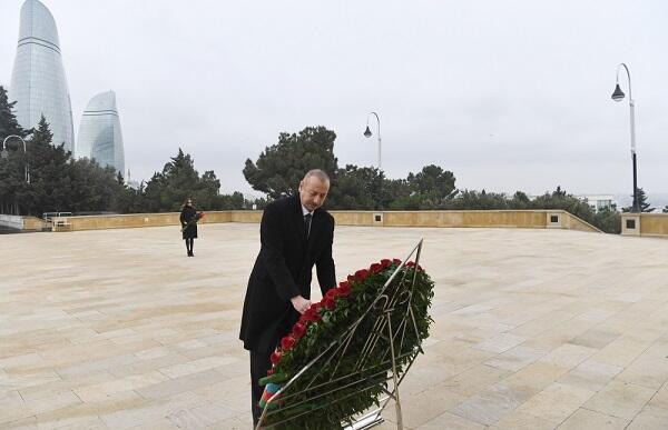 رئیس جمهور الهام علی اف بر روی بنای یادبود مشعل ابدی و مهریبان علیوا بانوی اول تاج گل را به نشانه احترام و گرامیداشت یاد و راه شهدای وطن روی تندیس یادبود گذاشت.