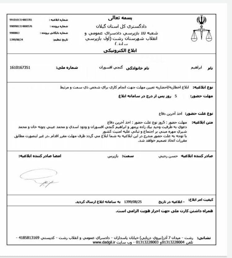 بنابه اطلاع آراز نیوز، امروز سه شنبه ۲۷ آبان ماه، شعبه ۱۰ بازپرسی دادسرای عمومی و انقلاب رشت مرکز استان گیلان، با ارسال ابلاغیه ای پنج تن از فعالان ملی آزربایجانی را فراخواند.