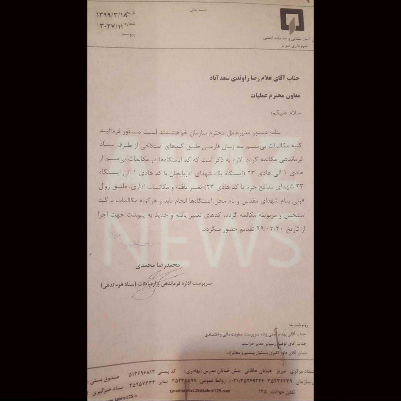 بنا به اطلاع آراز نیوز، طی نامهای که از سوی مدیر عامل سازمان آتشنشانی تبریز به معاونت عملیات این سازمان ارسال شده است، کارمندان این سازمان در مکالمات پشت بیسیم باید به زبان فارسی حرف بزنند.