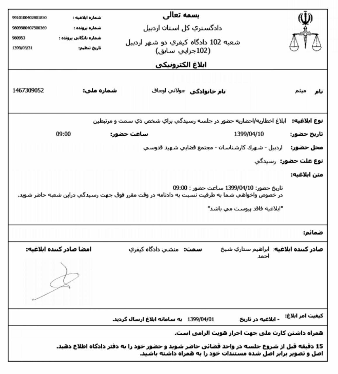 میثم جولانی فعال ملی مدنی آزربایجانی طی ابلاغیه ای که ۷ تیر ۹۹، از طریق سامانه ثنا دریافت کرده، مقرر شده است در ساعت ۹:۰۰ روز سه شنبه ۱۰ تیر جهت واخواهی حکم در شعبه ۱۰۲ دادگاه کیفری دو شهرستان اردبیل حاضر شود.