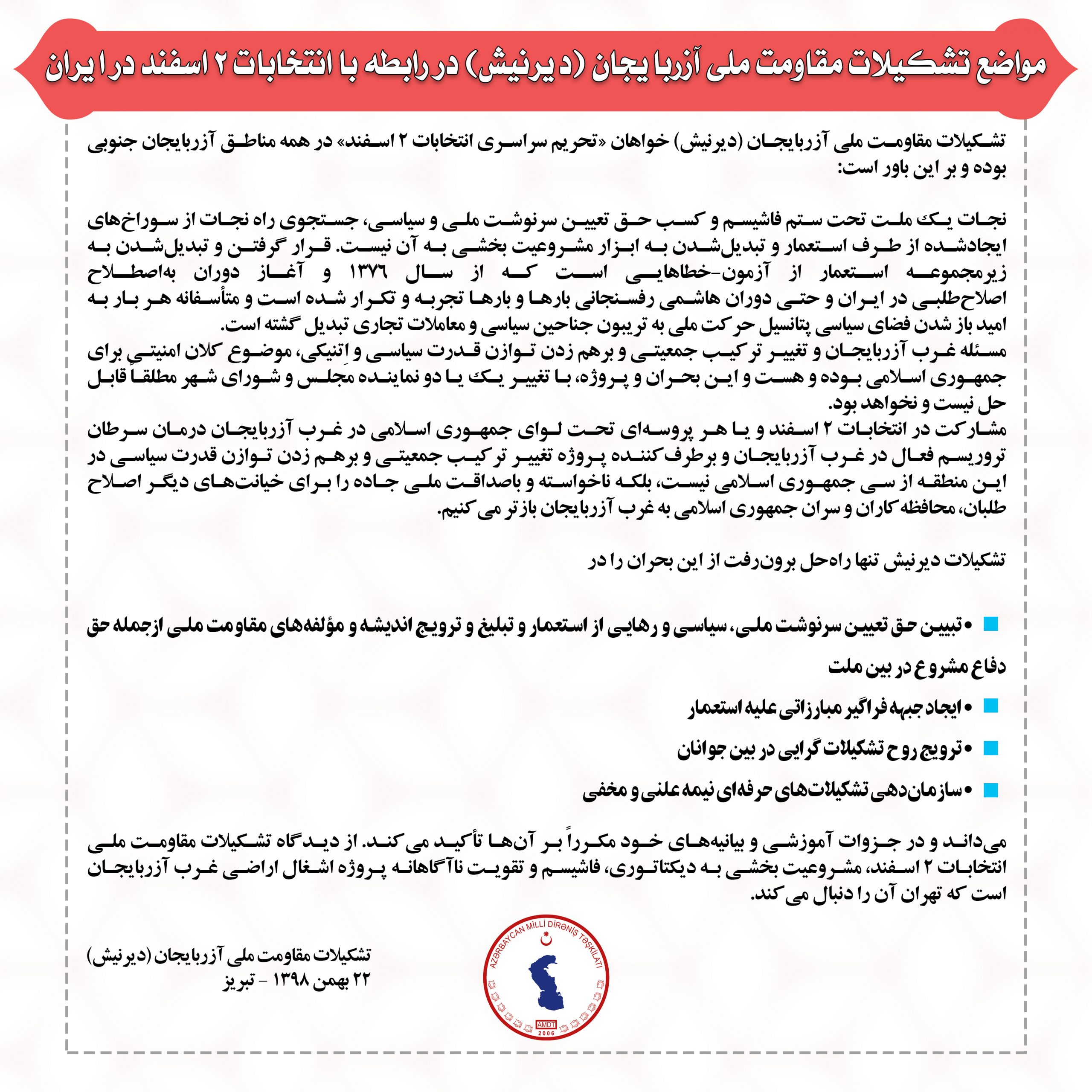 مواضع تشکیلات مقاومت ملی آزربایجان (دیرنیش) در رابطه با انتخابت ۲ اسفند