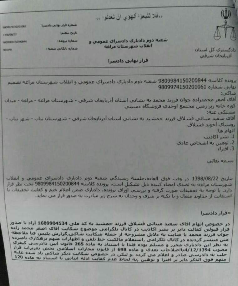 اصغر محمد زاده از شاگردان طباطبایی، عضو فعال تیم آذریها در تبریز و مولف کتاب «دارالعماره مراغه» که کتاباش با حمایت مالی یکی از اعضا لابی ارمنی در ایالات متحده و سفارت ارمنستان در تهران منتشر گریده است با بهانه قرار دادن مقاله پیوند پان ایرانیست با لابی ارمنی در مراغه که به قلم فردی به نام آراز ماراغالی نوشته شده بود پرونده عریض و طویل قضایی علیه سعید مینایی مدیر کانال تلگرامی«میلی دوشونجه» در دادگاه عمومی و انقلاب شعبه دو دادیاری مراغه طرح نموده است.