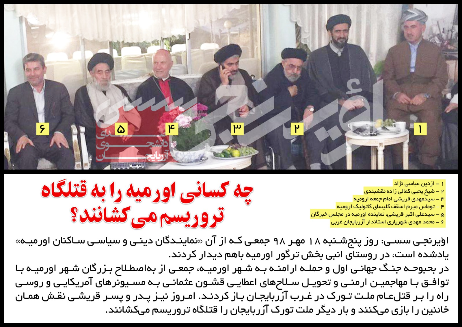 در بحبوحه جنگ جهانی اول و حمله ارامنه به شهر اورمیه، جمعی از بهاصطلاح بزرگان شهر اورمیه با توافق با مهاجمین ارمنی و تحویل سلاحهای اعطایی قشون عثمانی به مسیونرهای آمریکایی و روسی راه را بر قتلعام ملت تورک در غرب آزربایجان باز کردند. امروز نیز پدر و پسر قریشی نقش همان خائنین را بازی میکنند و بار دیگر ملت تورک آزربایجان را قتلگاه تروریسم میکشانند.