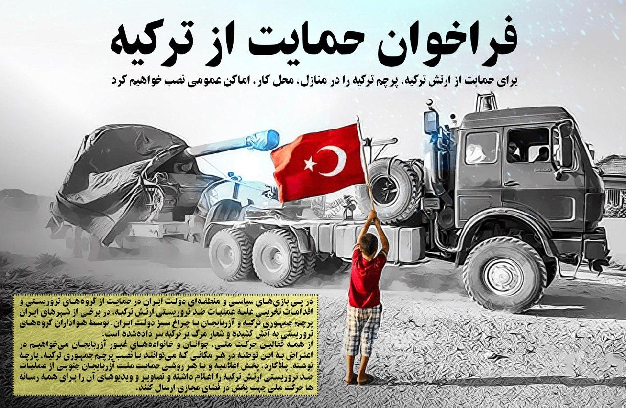 از همه فعالین حرکت ملی، جوانان و خانواده های با غیرت آزربایجان می خواهیم در اعتراض به این توطئه و حمایت از عملیات ضد تروریستی ارتش ترکیه علیه گروه های تروریستی در هر مکانی که می توانند با نصب پرچم جمهوری ترکیه، پارچه نوشته، پلاکارد، پخش اعلامیه و یا هر روشی که می توانند حمایت خود از عملیات ضد تروریستی ارتش ترکیه اعلام کرده و تصاویر و وئدیو های آنرا برای همه رسانه ها حرکت ملی برای پخش در فضای مجازی ارسال کنند.