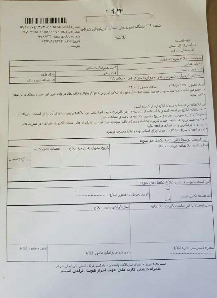 دادگاه تجدیدنظر آزربایجان شرقی با ارسال ابلاغیهای از عباس لسانی خواسته تا در ۲۴ فروردین ماه ۹۸ در دادگاه حاضر شود.