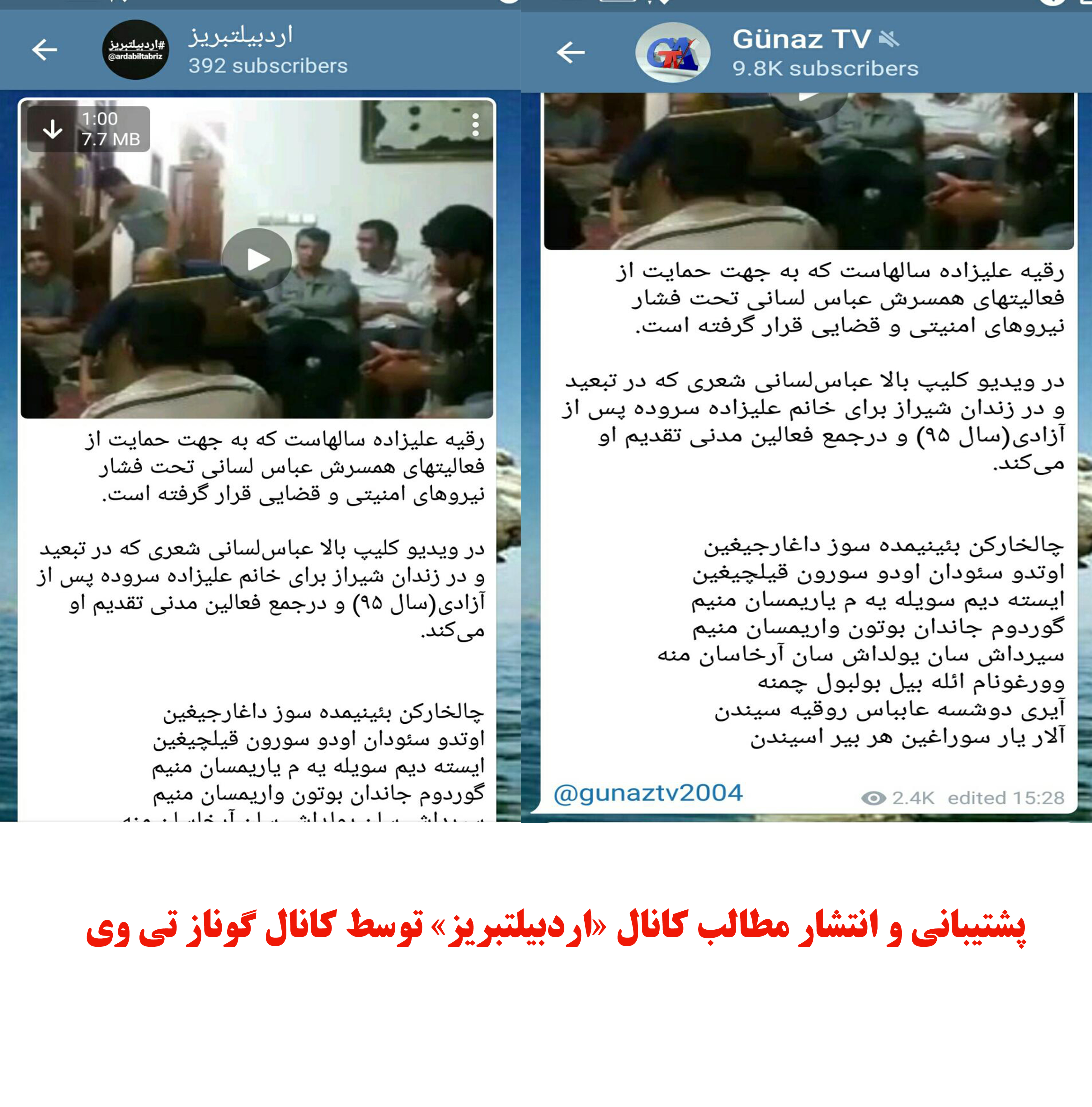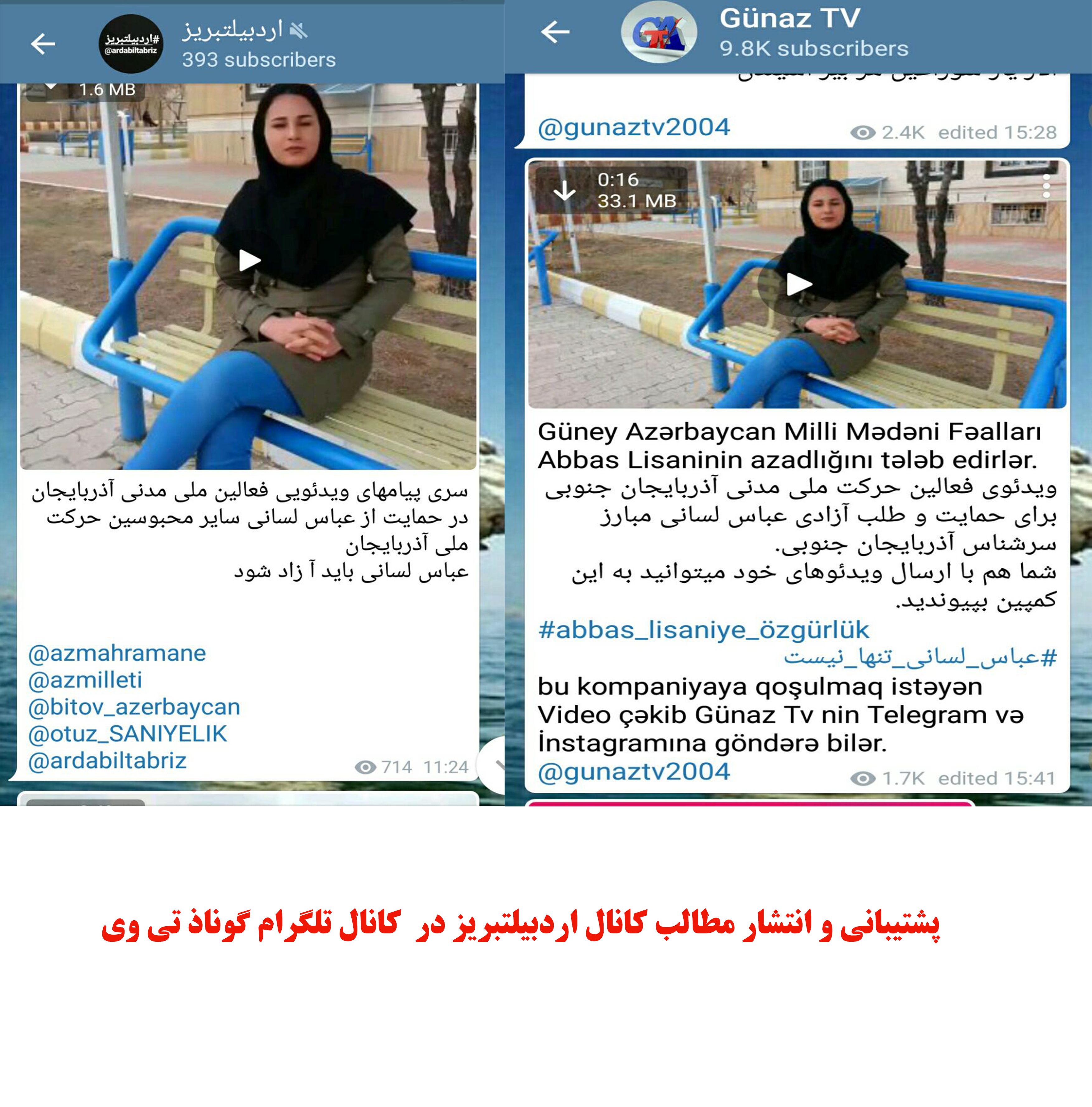 ۳- نکته سوم، کانال تلگرامی «گوناذ تی وی» و کانال تلگرامی «اردبیل تبریز» و سه کانال تلگرام که لینکهای یکدیگر را پشتیبانی میکنند، بهصورت همزمان، در یک ساعت معین و با فرمتهای یکسان خبری موضوع بازداشت جناب عباس لسانی را بهصورت انحصاری پوشش میدهند (چنانکه در تصاویر نیز مشاهده میشود پستهای خبری «گوناذ تی وی» و «اردبیل تبریز» عیناً و تنها بافاصله چند دقیقه آپلود شده است) وبسایت آرازنیوز نیز بعد از دریافت فایل صوتی و انعکاس آن در کانالهای زیرمجموعه «گوناذ تی وی» اقدام به انتشار این فایل صوتی نمود شایانذکر است اگر برخی مدعی این موضوعات را رد میکنند، فایلهای فوروارد شده از کانال «اردبیل تبریز» (یکی از کانالهای پنجگانه مورد تائید گوناذ تی وی که لینکهای پشتیبانیاش را تبلیغ میکند) همانطور که در تصویر دیده میشود کماکان در گروههای تلگرامی قابلدسترسی میباشد.