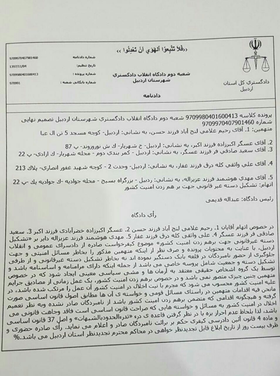 رحیم غلامی، عسگر اکبر زاده، علی واثقی، مهدی هوشمند و سعید صادقی فر اواخر ماه گذشته طی احضاریههای جداگانهای به شعبه دوم دادگاه انقلاب شهرستان اردبیل احضار شده بودند.