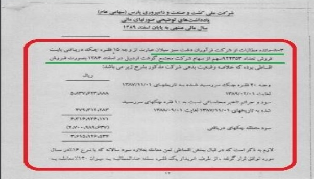 ۷- گرچه دادستان عمومی و انقلاب اردبیل اعلام کرده که؛ خریداران مجتمع صنعتی گوشت اردبیل «تاکنون هیچ رقمی از وجوه متعلق به دولت و بانک ملی را پرداخت نکردهاند»لیکن به موجب بند ۸ ص ۱۲ و یادداشت ۴-۸ آن در ص ۱۵-۱۴ گزارش حسابرسی شرکت کشت و صنعت پارس در سال ۸۸ ،بند ۸ ص ۱۱ و یادداشت ۳-۸ آن در ص ۱۳-۱۲ گزارش حسابرسی شرکت کشت و صنعت پارس در سال ۸۹ و بند ۸ ص ۱۱ و یادداشت ۲-۸ آن در ص ۱۲ گزارش حسابرسی شرکت کشت و صنعت پارس در سال ۹۰ و گزارش کارشناسی شماره ۶۲۰ مورخ۱۳۹۰/۱۲/۱۵کارشناس رسمی دادگستری و بندهای " ۱۰-۷" و" ۶-۵-۶" ، "۶-۶-۴" صص ۱۹،۲۰ و ۳۲ صورتهای مالی منتهی به ۹۰/۱۲/۲۹«شرکت سرمایه گذاری گروه توسعه ملی سرمایه گذاری بانک ملی ایران»، «بین الملل ساختمان و صنعت ملی»، «فرآوران دشت سـبز سـبلان» و «شرکت نداآوران» با امضای مبایعه نامه ای موافقت خودرا با نحوه تهاترو تسویه ثمن مبایعه نامـه اعـلام کردهاند که براساس آن شرکت فراورآن دشت سبلان سبز مطابق تصویر زیر بابت تسویه بخشی از بدهی های خود از محل واحد مسکونی تکمیل شده و در جریان ساخت واقع در تبریز و تهران تهاتر شود.