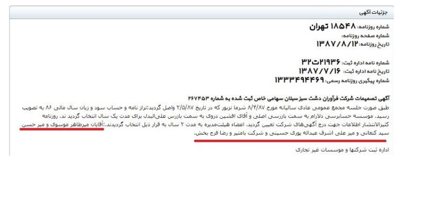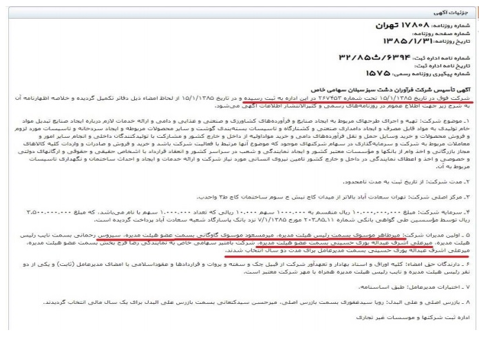«شرکت بام تیر» (سهامی خاص) این شرکت در تاریخ ۶۸/۶/۲۱ تأسیس و محل اقامت قانونی آن نیز دقیقاً همان محل اقامت «شرکت فرآوران دشت سبز سبلان» است و آقای «میرطاهر موسوی» رئیس هیات مدیره و یکی از سه سهامدار اصلی آن میباشد.