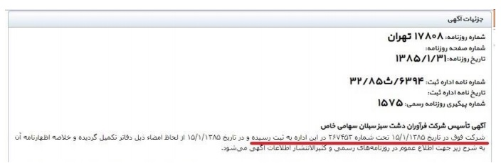 نکته جالب و درخور تأمل اینجاست که شرکت «فراوران دشت سبز سبلان» در تاریخ ۸۵/۱/۱۵(حدود ۴۰-۳۰ روز پس از واگذاری مجتمع موصوف) تأسیس شده است!!